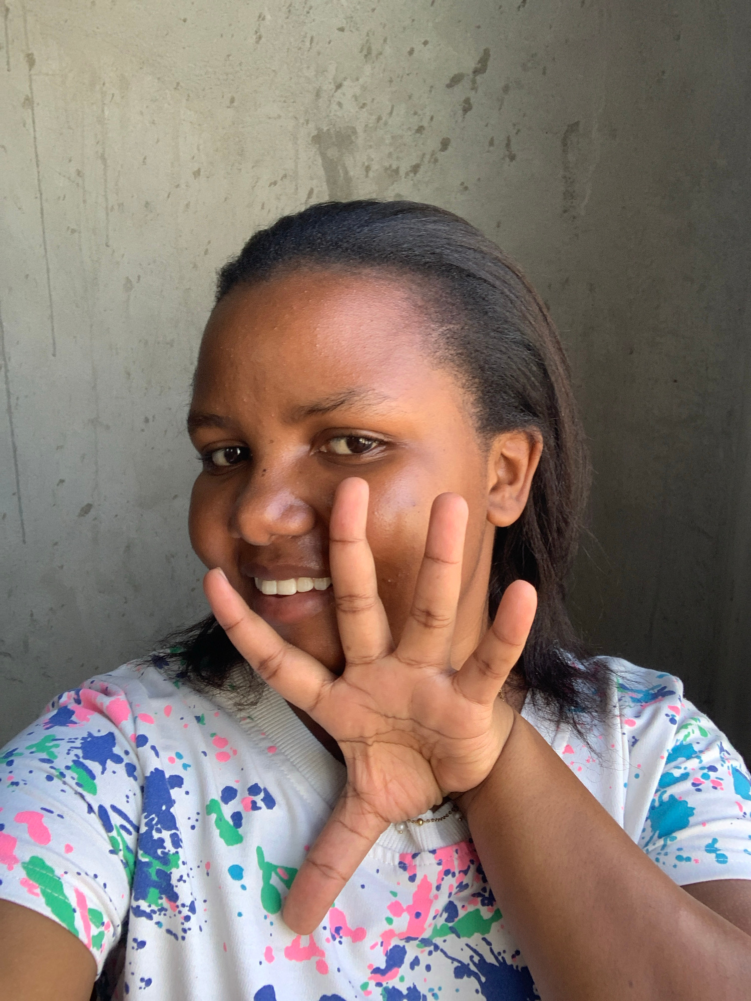 A woman with dark hair and skin is smiling and holding up her left hand, partially obscuring her face. She is wearing a white t-shirt with splattered paint designs in blue, pink, and green. The backgr…read more