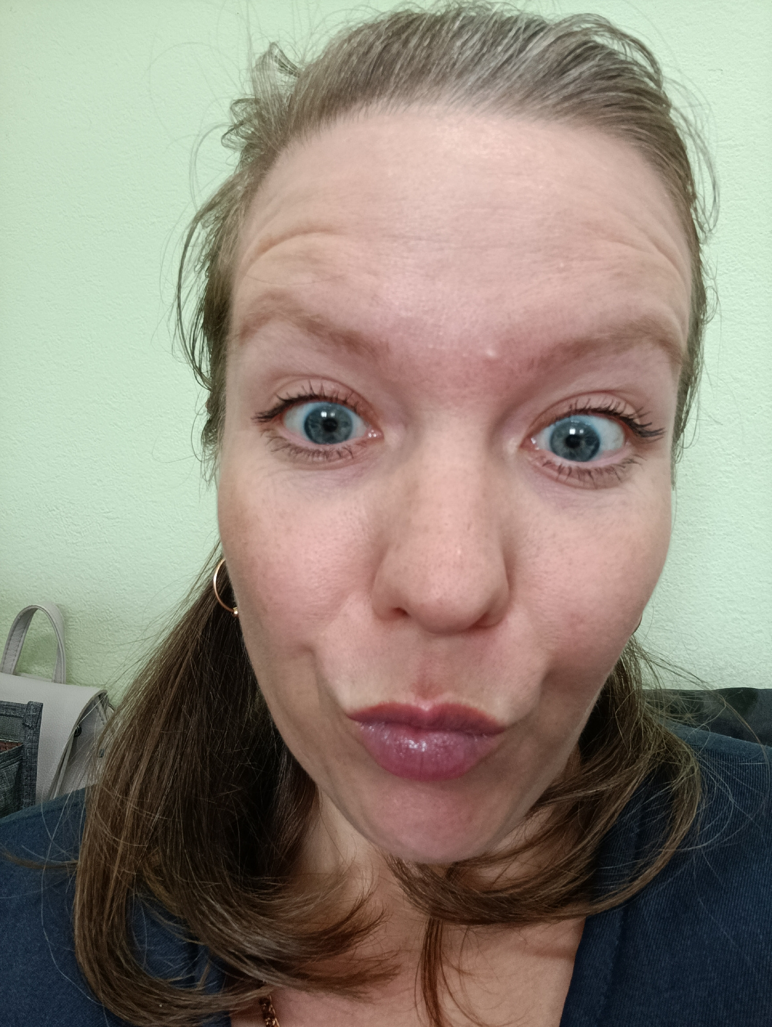 A close-up selfie depicts a woman with fair skin, blue eyes, and light brown hair pulled back loosely. Her expression is playful, with pursed lips and slightly widened eyes. She is wearing a dark blue…read more