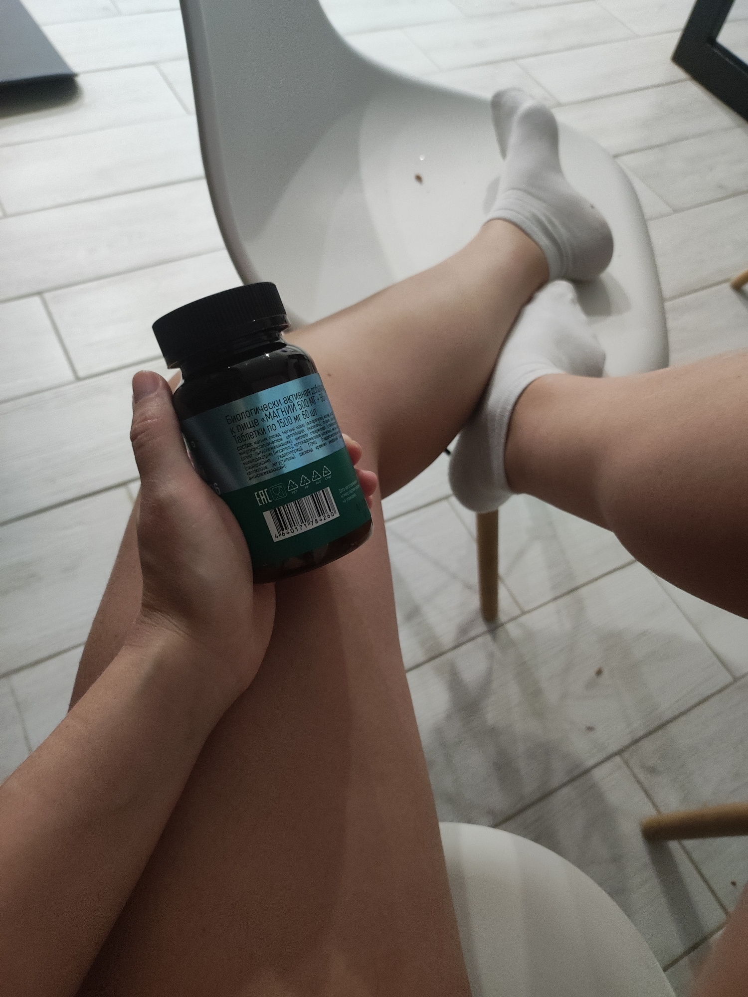 The image depicts a person sitting on a white chair in Votkinsk, Russia, with their legs crossed. They are wearing white socks. In their left hand, they hold a dark green bottle with a black cap. The…read more