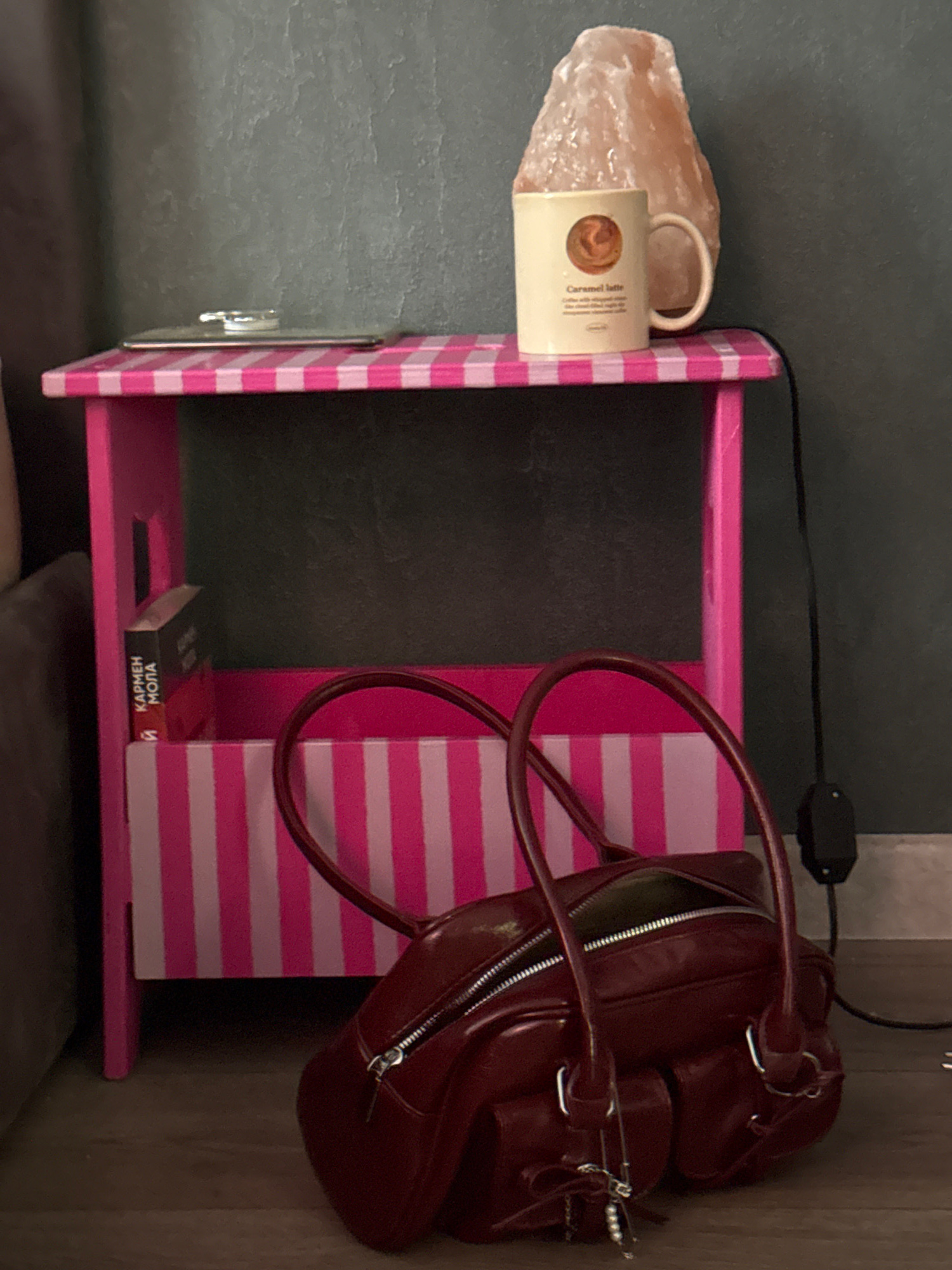 The image shows a bedside table with various items on it. On the left side of the table is a salt lamp and a mug with the words "Caramel latte" on it. On the right side of the table is a red handbag. Inside the table is a book with the title "КАРМЕН МОДА." The table itself is pink and white striped. The location is unknown. | Open Wire