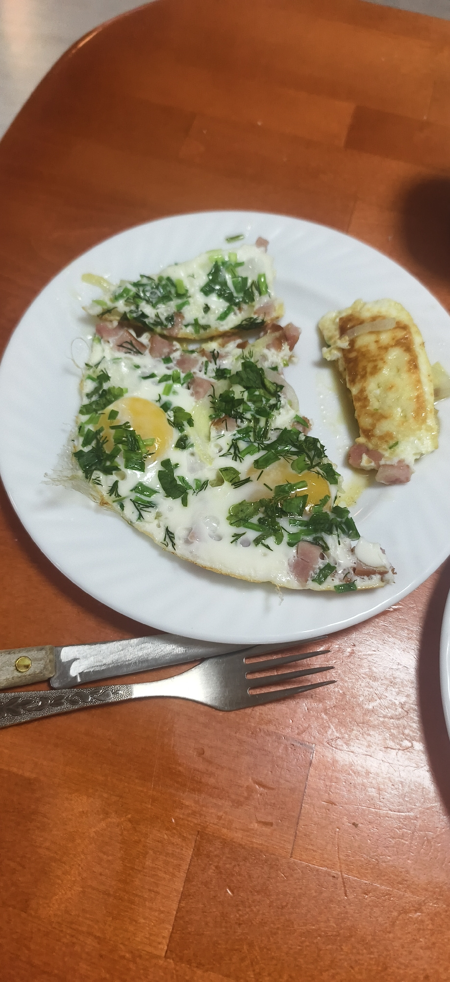 A white plate containing fried eggs with green herbs and small pieces of meat sits on a wooden table. A fork and knife rest beside the plate on the table. Part of another white plate is visible in the…read more