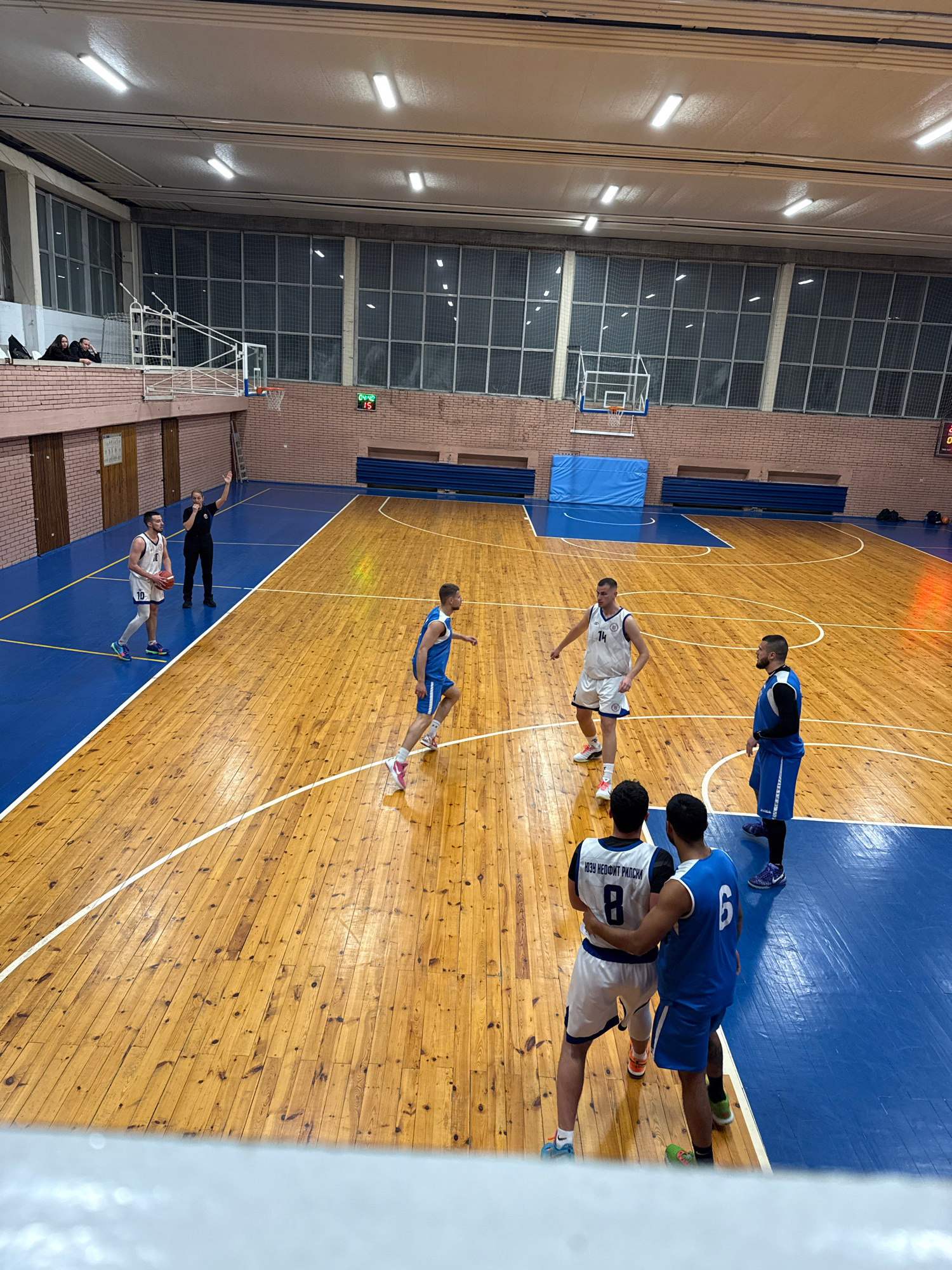 The image captures a basketball game in progress on an indoor court. The court has a wooden floor with blue-painted borders. Several players wearing blue and white uniforms are engaged in the game. Onβ¦read more