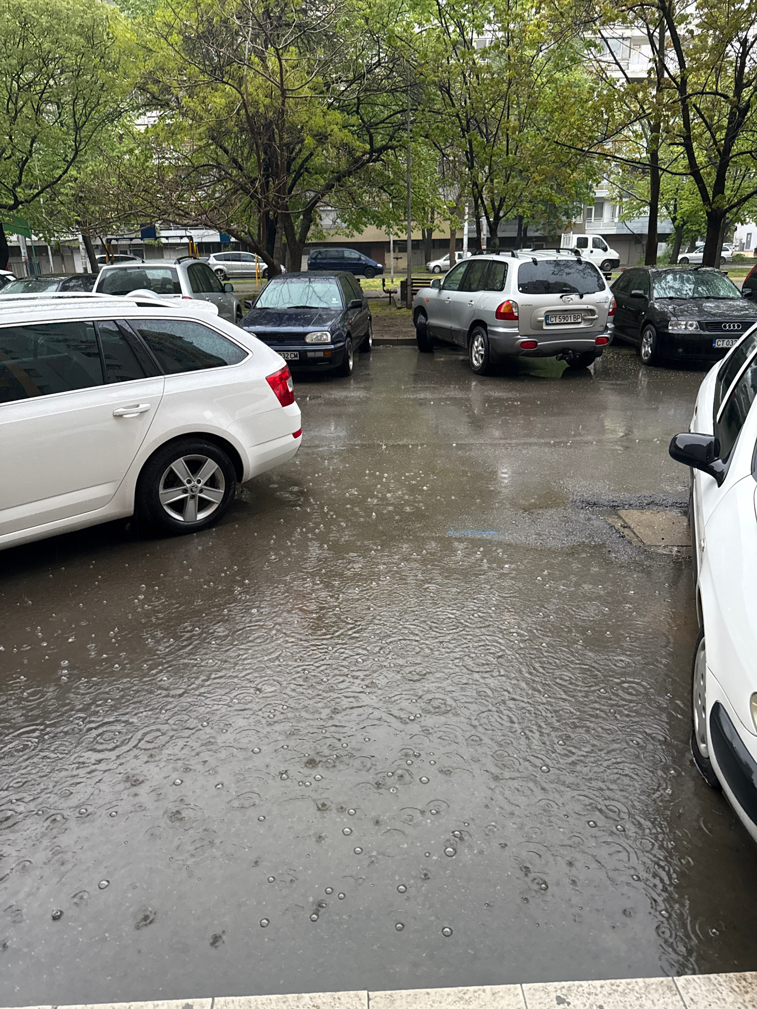 The image depicts an urban street scene during a rain shower, viewed from a slightly elevated perspective. The primary subject is a wet asphalt street covered in puddles, where countless falling raind…read more