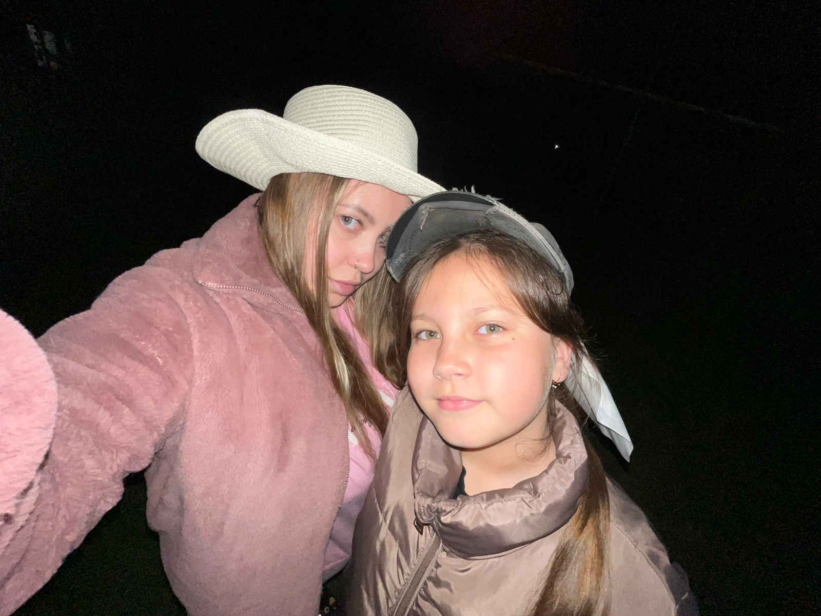 Two young individuals are depicted in the image. One is wearing a brown puffy jacket and a gray hat, while the other is dressed in a pink furry jacket and a white hat. The picture appears to have been…read more