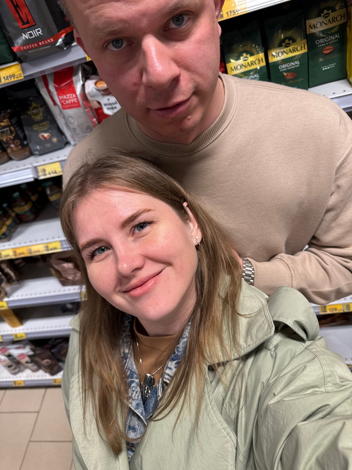 Here is a detailed description of the image: **Scene:** The image appears to be a selfie taken by a couple inside a grocery store. They are standing in an aisle with shelves stocked with coffee produ…read more