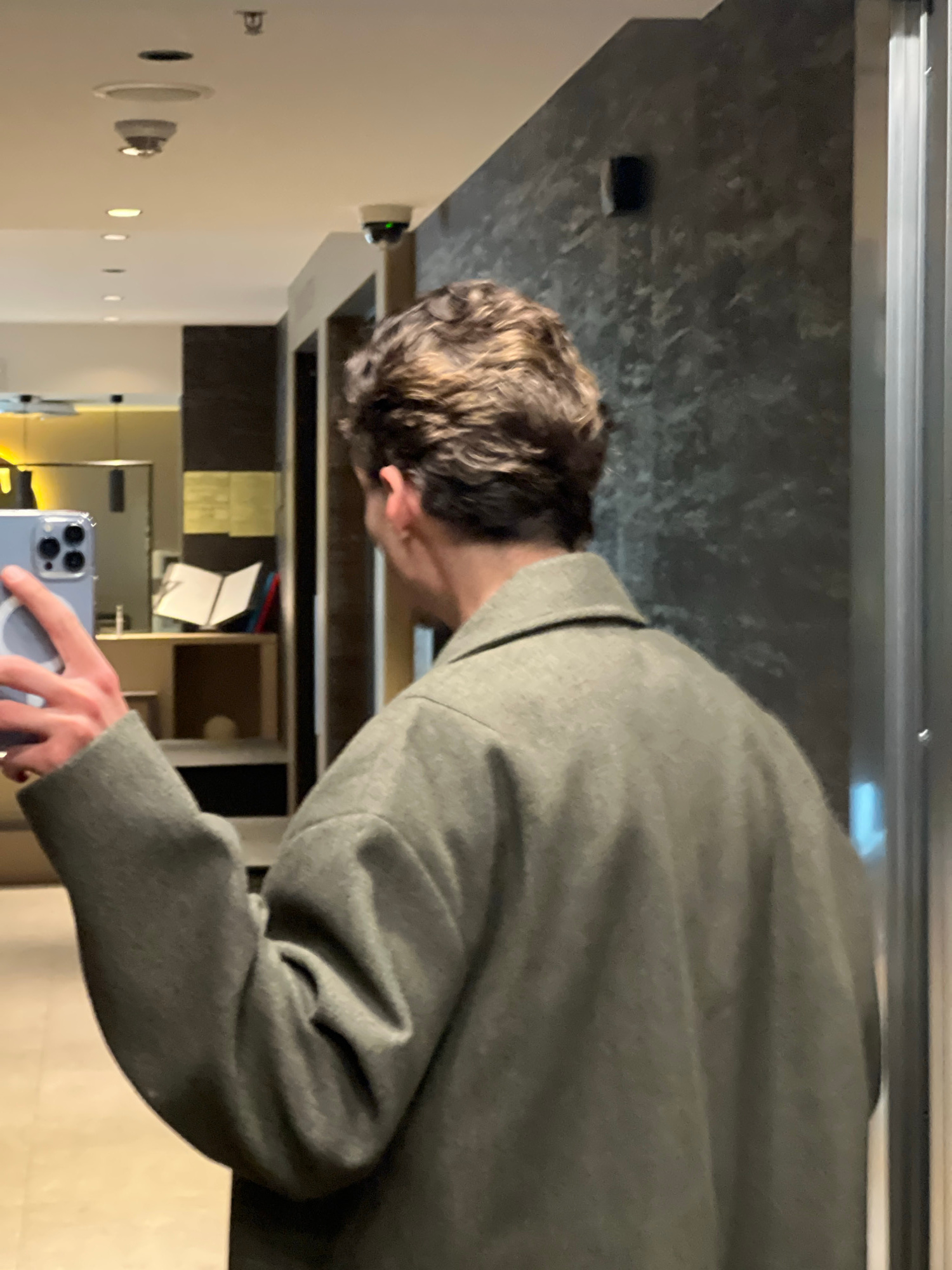 The image shows a man taking a selfie in a brightly lit hallway. The man is wearing a grey coat. He is holding a blue iPhone in his right hand. The hallway has a dark grey wall on the left, and a whit…read more