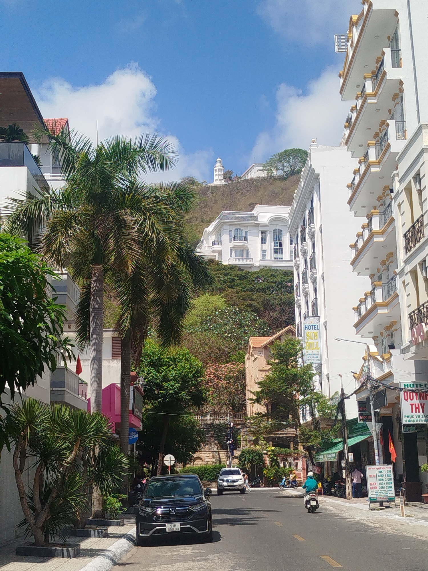 The image depicts a street scene in a Vietnamese city. A two-lane road slopes upward, with a black Honda CR-V parked on the left side and a white SUV further ahead. A person rides a scooter in the cen…read more