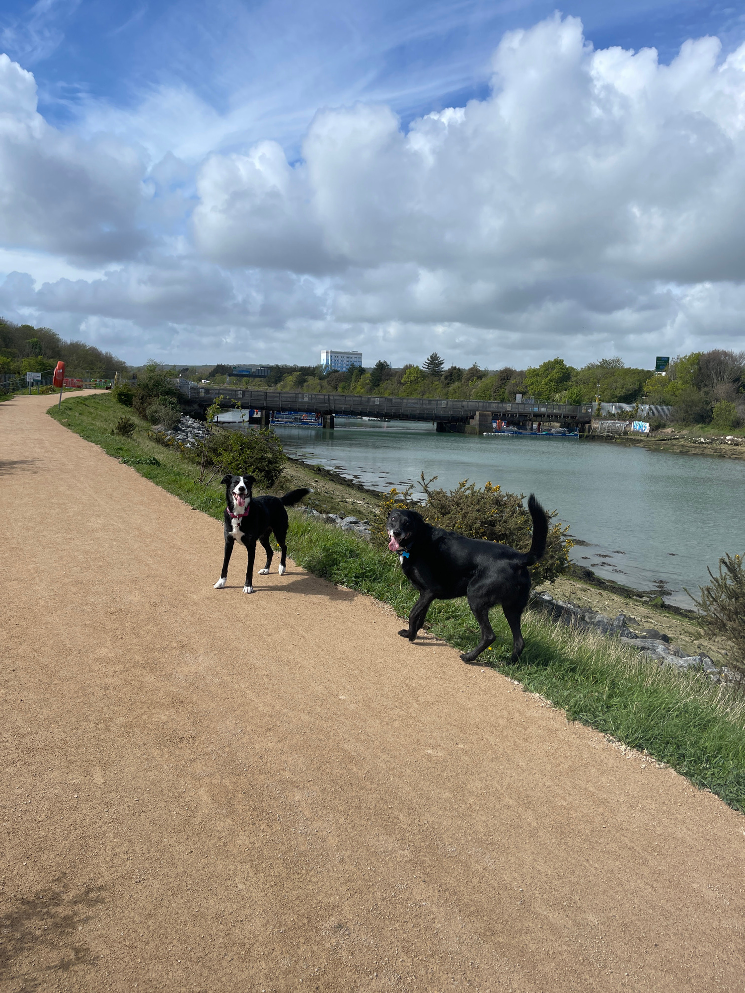This image, taken in Portsmouth, United Kingdom, depicts an outdoor scene along a waterside path on a partially cloudy day. The perspective is slightly elevated, looking across a wide body of water, l…read more