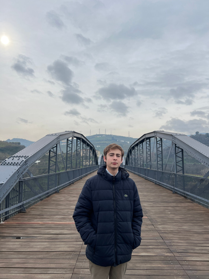A young adult male stands centrally on the wooden deck of the metallic truss bridge, identified as the Old Road Bridge (Ponte Velha) in Peso da Régua, Portugal. He has short light brown hair and a neu…read more