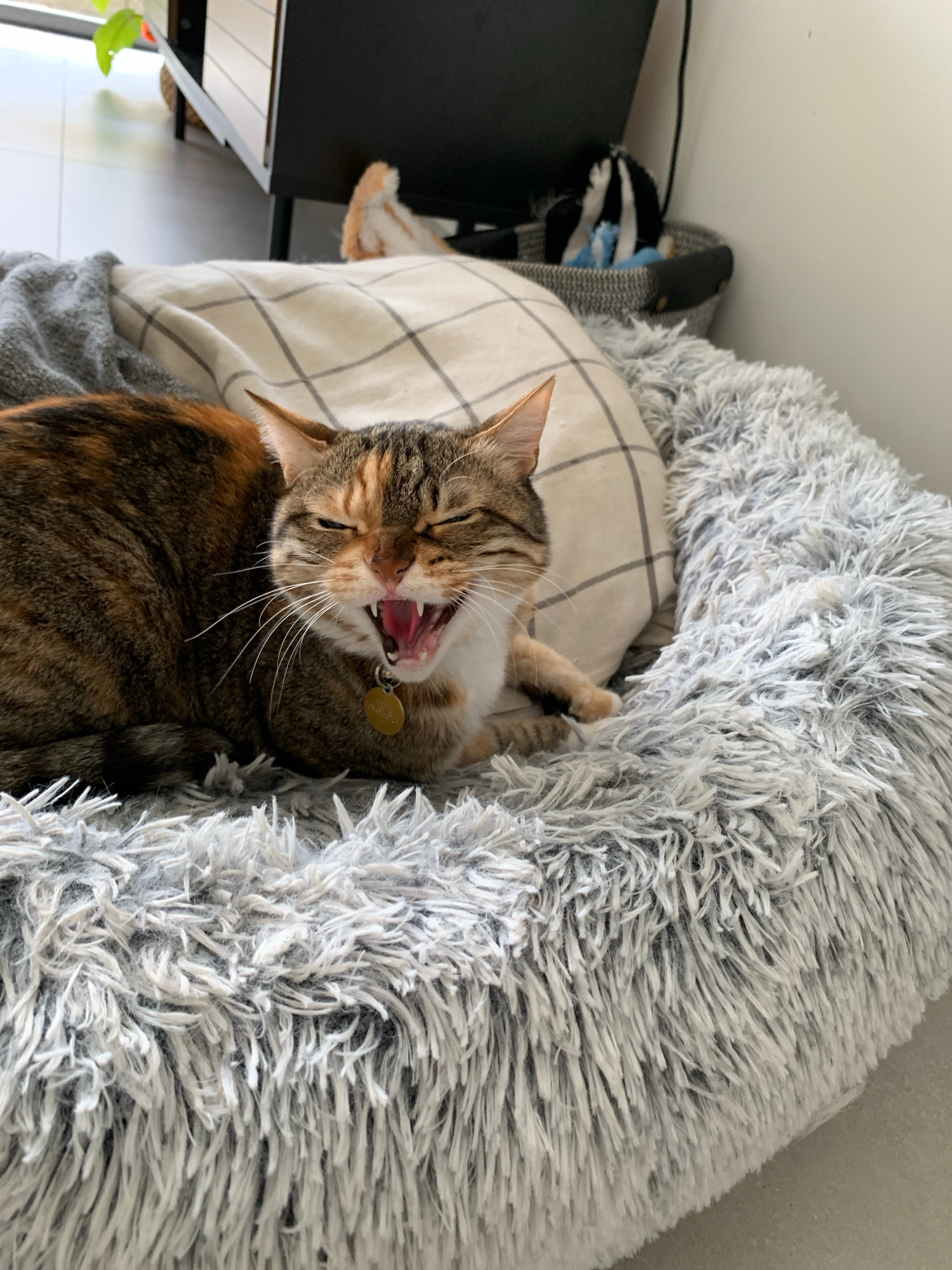 The image depicts a cat yawning in a gray, fluffy pet bed. The cat is a tortoiseshell tabby with brown, black, and orange markings, a gold collar tag, and open mouth. The bed is placed on top of a whi…read more