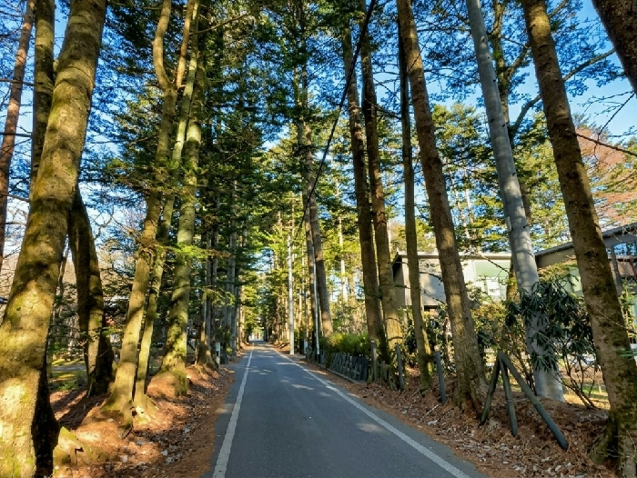 The image displays a sunlit, paved road in Karuizawa, Japan, bordered on both sides by a dense arrangement of tall, mature trees. The asphalt road, appearing dry, extends into the background, narrowin…read more