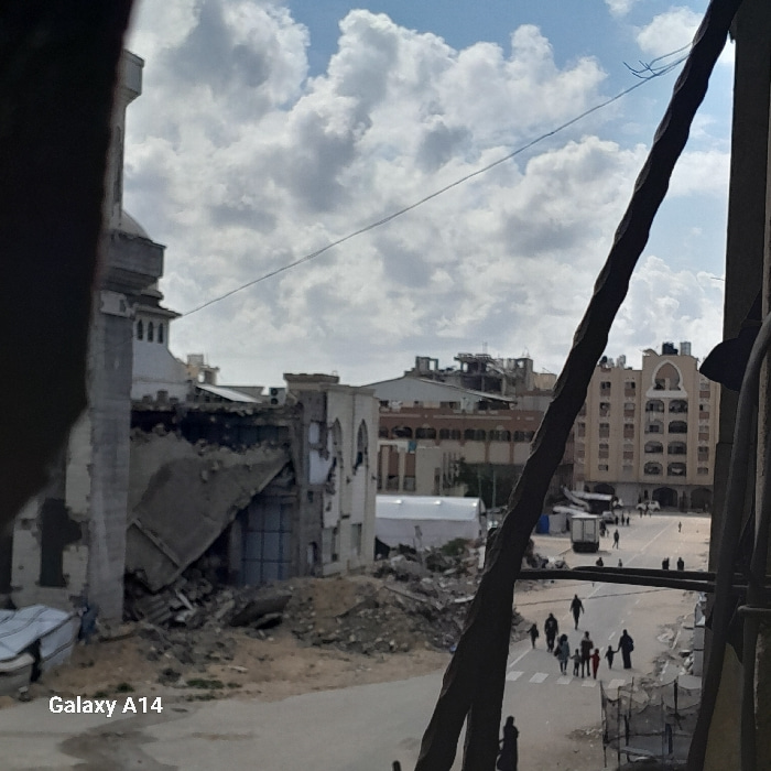 The image presents a scene of extensive urban damage in Khan Yunis, Palestinian Territory, under a partly cloudy sky. The perspective is from an elevated position, framed by dark, out-of-focus structu…read more