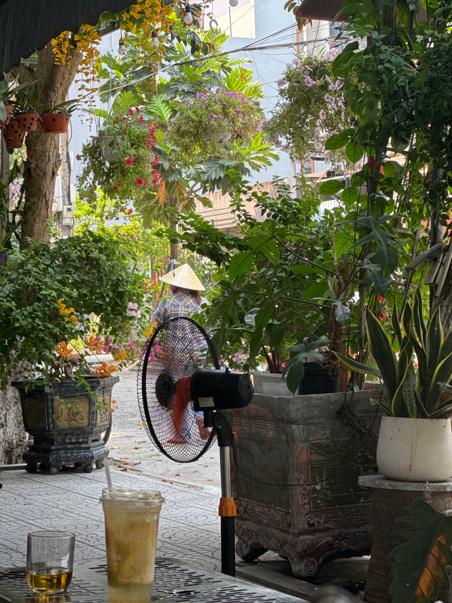 The image shows a scene likely in a café or outdoor seating area in Đà Nẵng, Vietnam. The camera angle is low, looking upwards through a canopy of lush greenery and hanging plants. The vegetation incl…read more