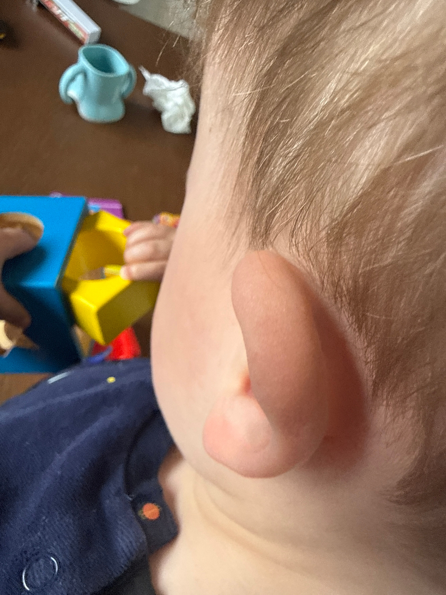The image provides a close-up, overhead view of a young child, focusing on the back of their head and ear. The child has light brown or blonde hair. Their hands are visible towards the bottom of the f…read more