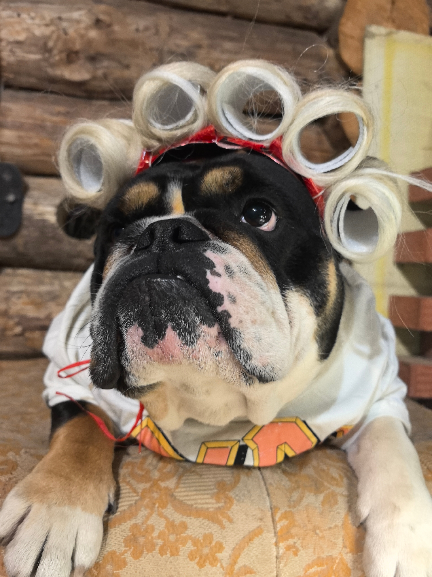 A bulldog is positioned indoors, likely on a cushioned surface. The dog is wearing a white shirt and has hair rollers affixed to its head with a red band. The background appears to be a log cabin stru…read more