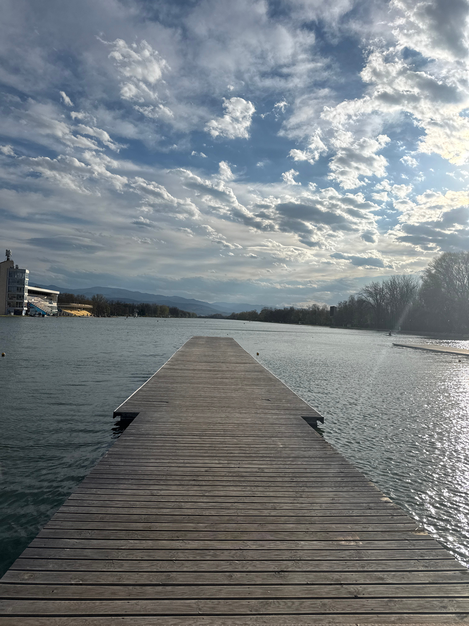 A ground-level, medium shot of a wooden dock extending into a body of water, likely Lake Plovdiv, in Plovdiv, Bulgaria. The weathered, gray-toned dock has vertical planks and juts out towards the lake…read more