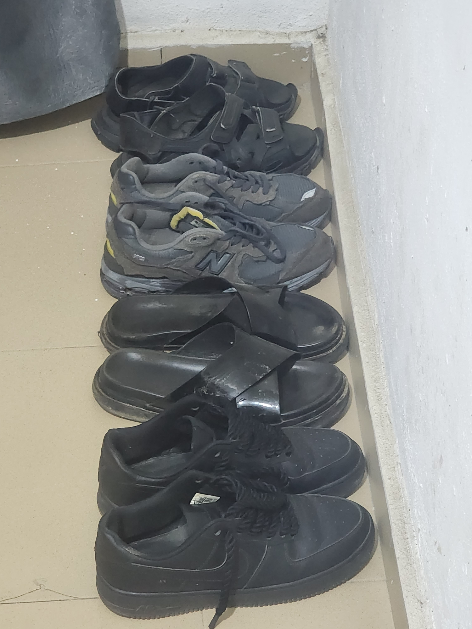 A shoe rack containing six pairs of shoes is mounted to the wall of a room. The shoes are arranged from left to right, consisting of two pairs of sandals, a pair of grey running shoes with yellow deta…read more