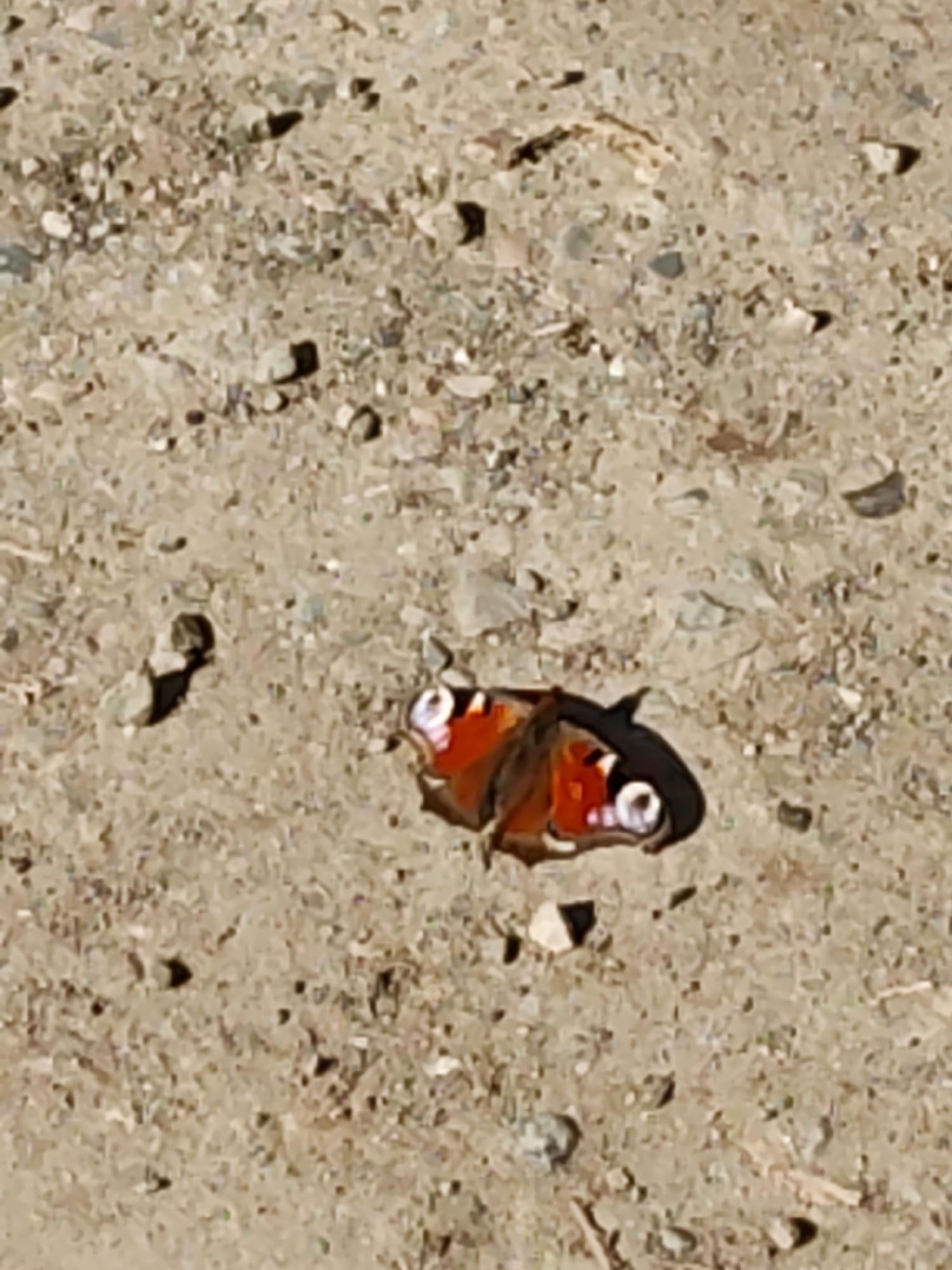 The image displays a vibrant Peacock Butterfly (Aglais io) resting on a sun-drenched, gravelly ground. The butterfly, positioned in the lower-middle section, has its wings slightly open, showcasing itβ¦read more