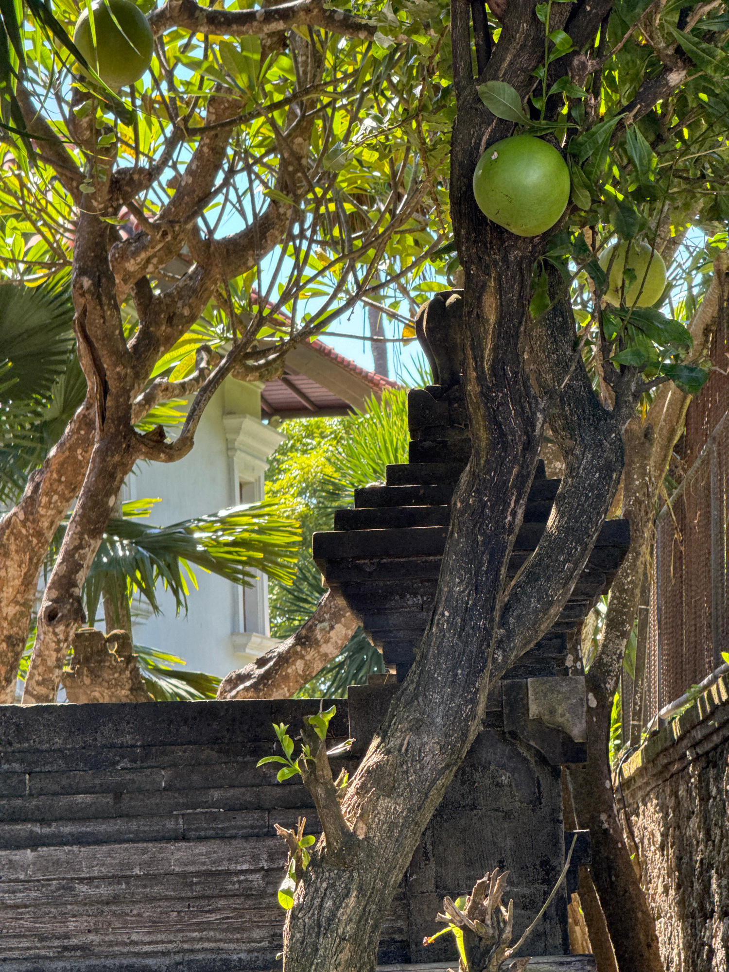 The image presents a vibrant, sunlit scene dominated by the intricate network of a large tree's branches and foliage. The primary subject is a tree laden with several round, bright green fruits, possi…read more