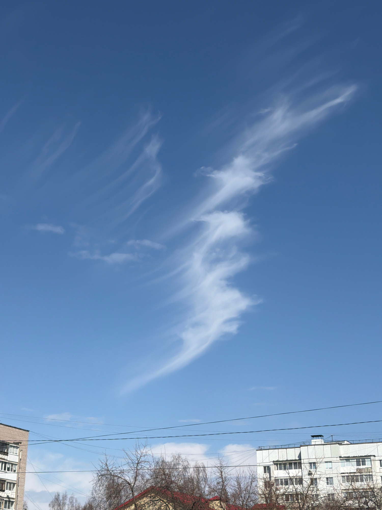 An outdoor wide shot captures a clear, bright blue sky filled with striking, elongated white cirrus clouds, indicative of fair weather. The clouds stretch across the sky in wispy, feathery patterns fr…read more