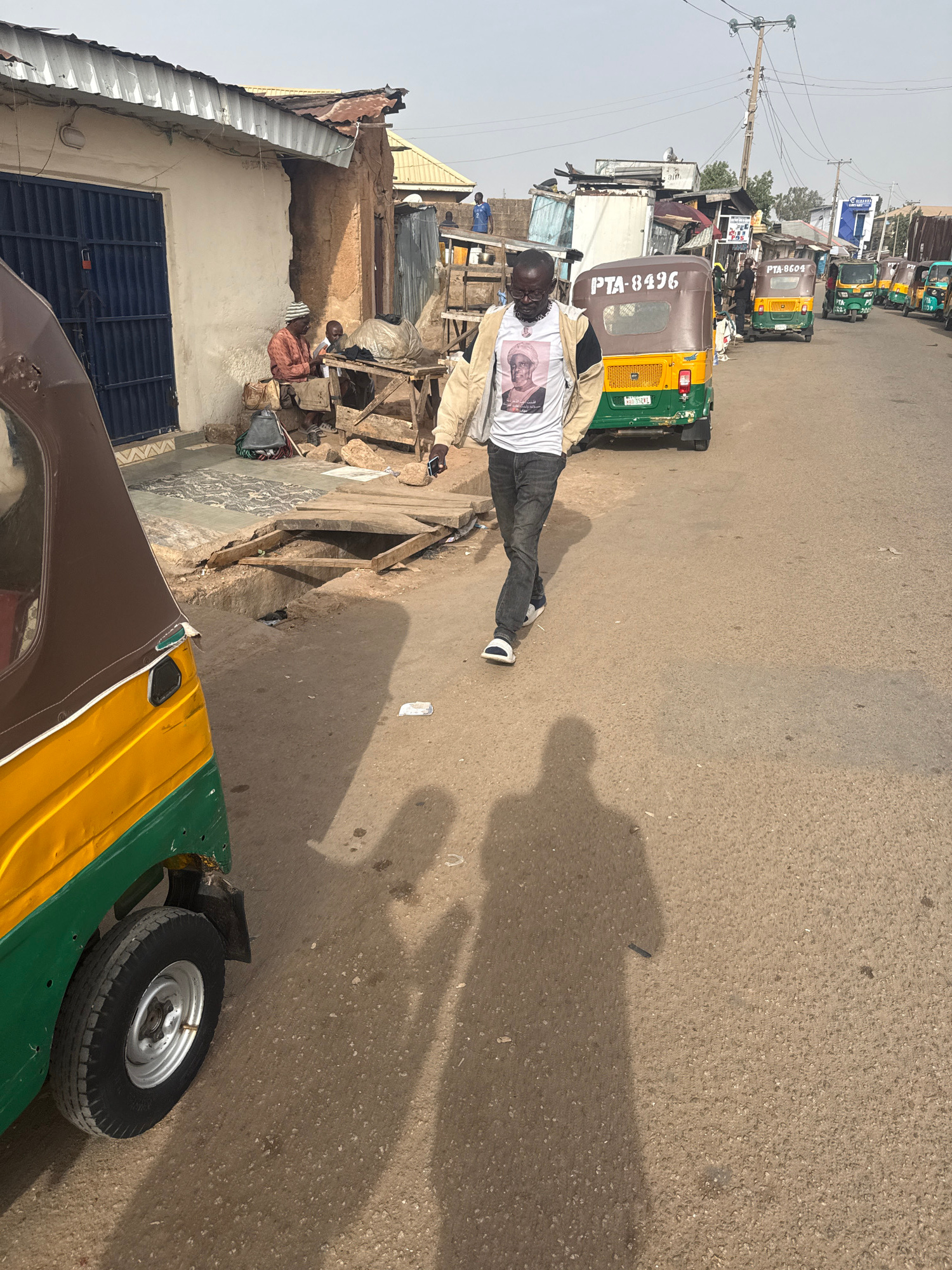 The image depicts a street scene in Jos, Nigeria, featuring a man walking down a paved road. He is wearing a white t-shirt with an image on it, dark pants, and sneakers. Several auto-rickshaws are par…read more
