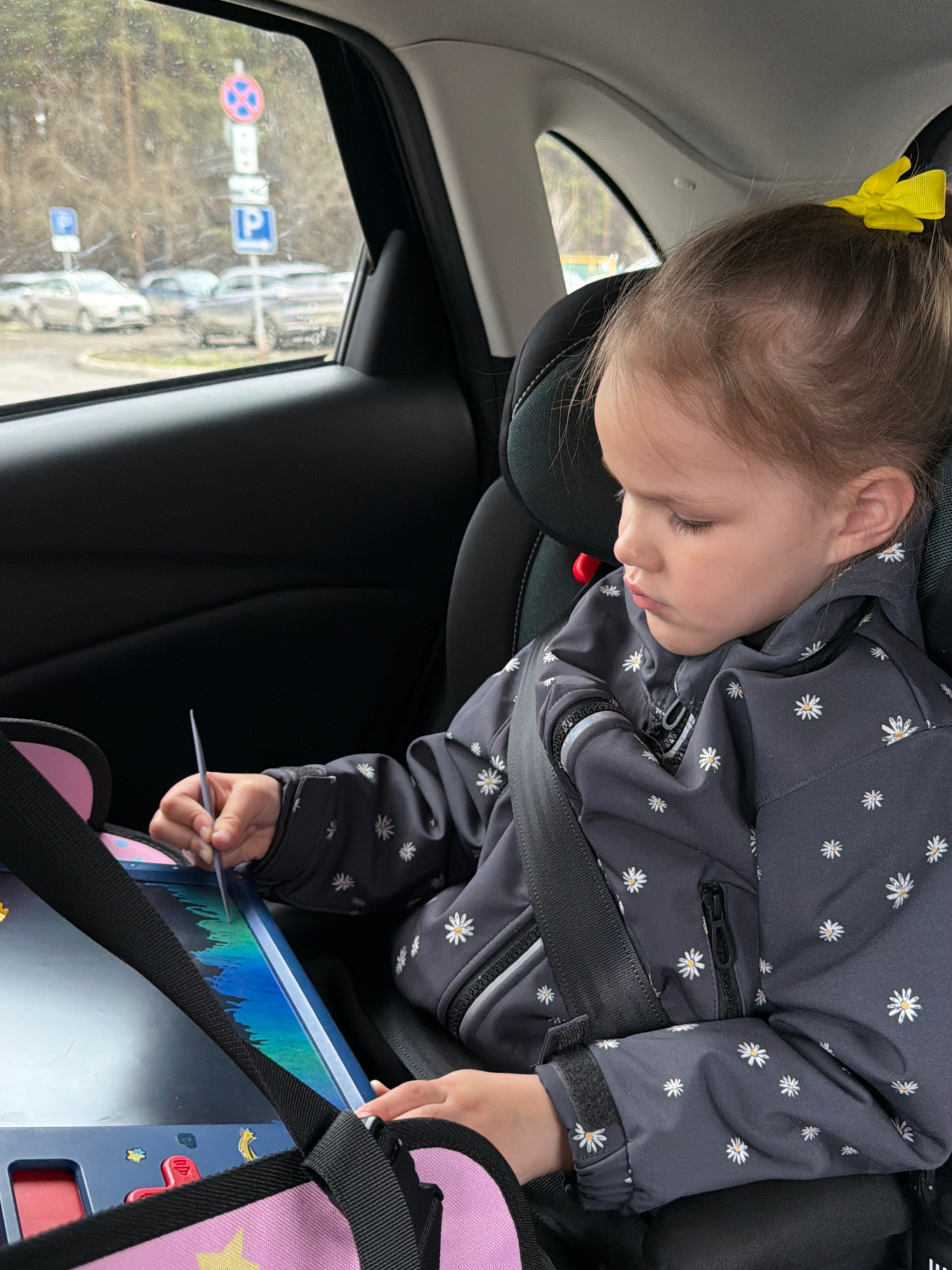 A young child is seated in a car seat, secured with a seatbelt, inside a vehicle. The child is wearing a dark jacket with a floral pattern and a yellow hair bow. The child's eyes are closed. The childβ¦read more