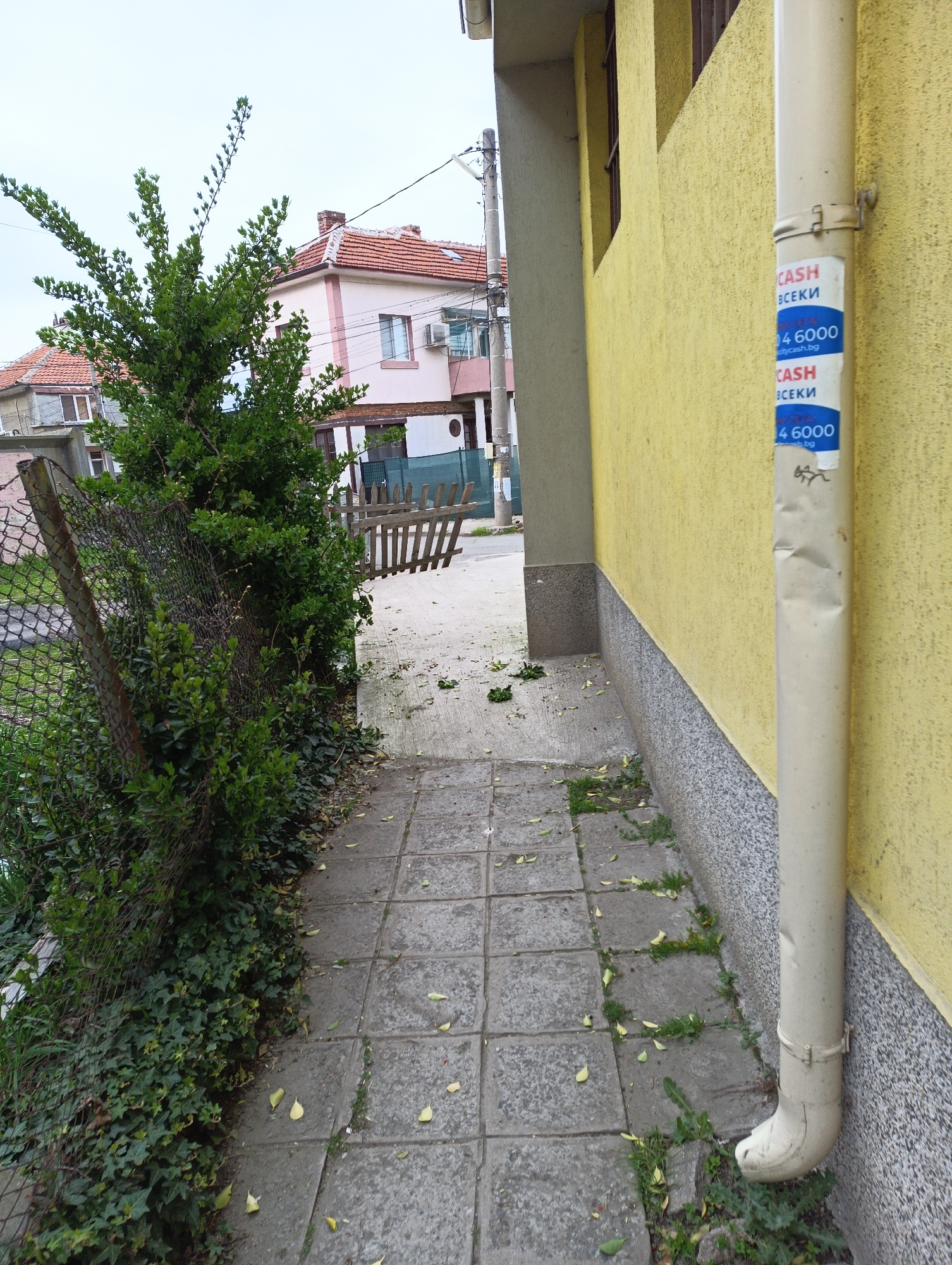 The image depicts a narrow walkway in Karnobat, Bulgaria, bordered on one side by a fence overgrown with vegetation and on the other by the yellow exterior wall of a building. The walkway is paved wit…read more