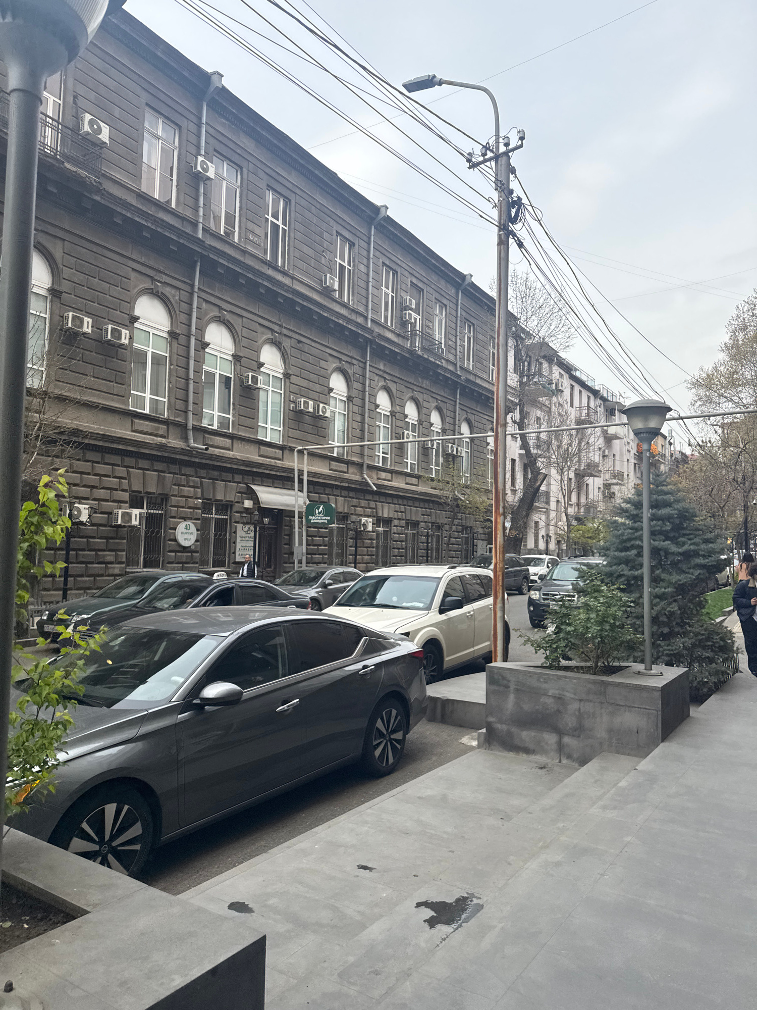 The image shows a street scene in Yerevan, Armenia, featuring a dark-gray, multi-story building with a facade of textured stone blocks and evenly spaced, arched windows. Each window has an air conditiβ¦read more