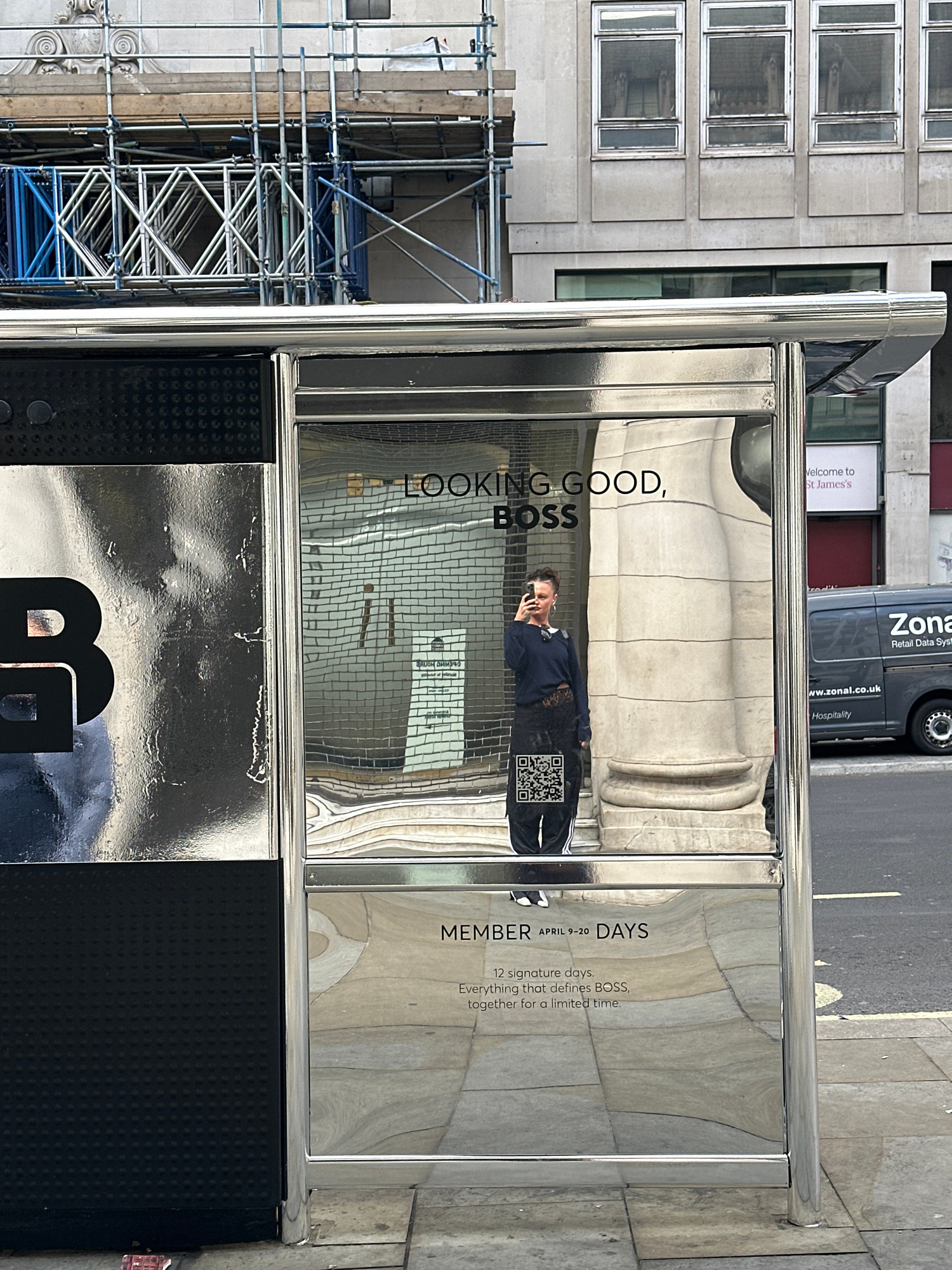 The image depicts a reflective advertising panel for BOSS, situated on a sidewalk in London, United Kingdom. The advertisement features the text "LOOKING GOOD, BOSS," accompanied by an image of a man…read more