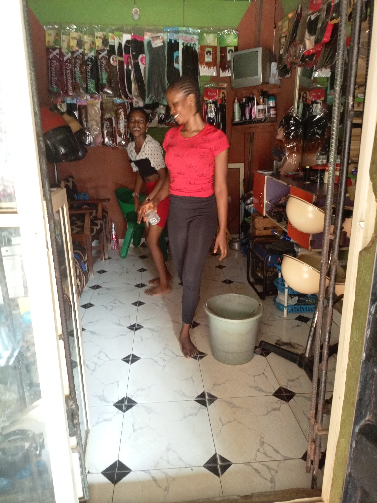 This smartphone photograph, likely taken in Onitsha, Nigeria, captures an indoor scene of what appears to be a busy hair salon or beauty supply store. Two women are the primary subjects. The woman in…read more