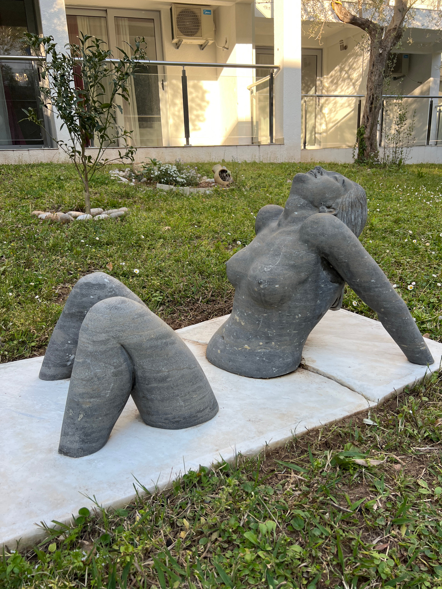 A partly-buried, grey, stone sculpture of a woman lies on white marble or stone slabs set into the grass. The sculpture is split into two pieces, a torso with one arm raised, and two legs bent at the…read more