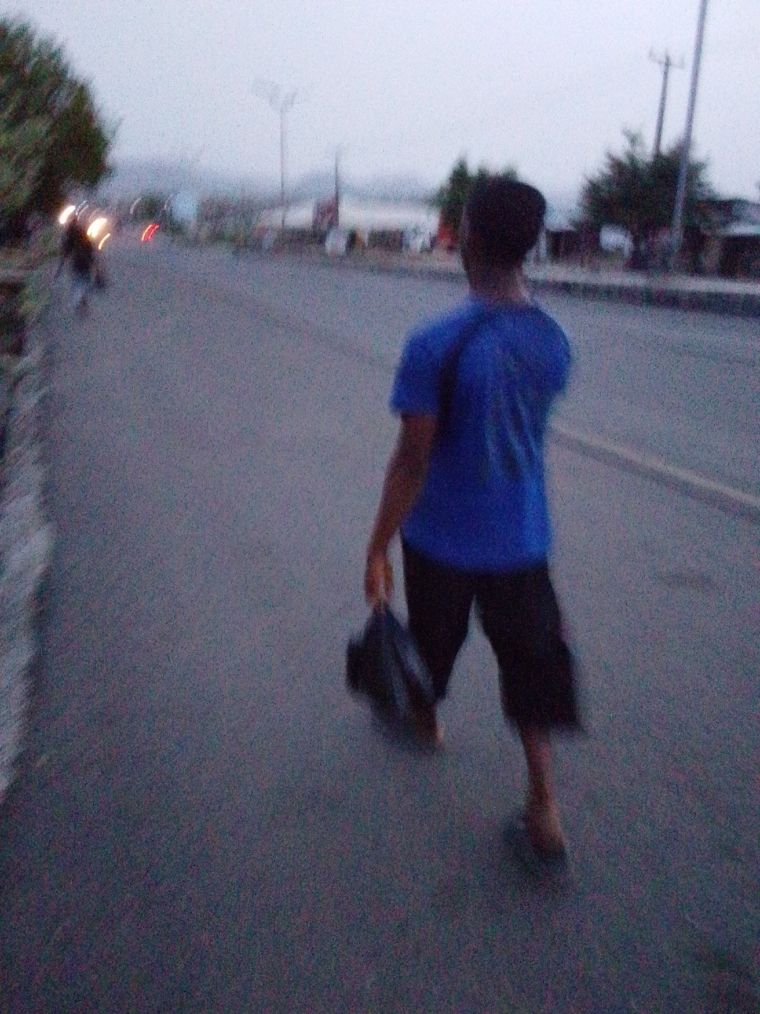 A person walks along a road in Lokoja, Nigeria. The person is facing away from the camera and is wearing a blue shirt and dark shorts. They are carrying a bag in their left hand. The road is paved and…read more