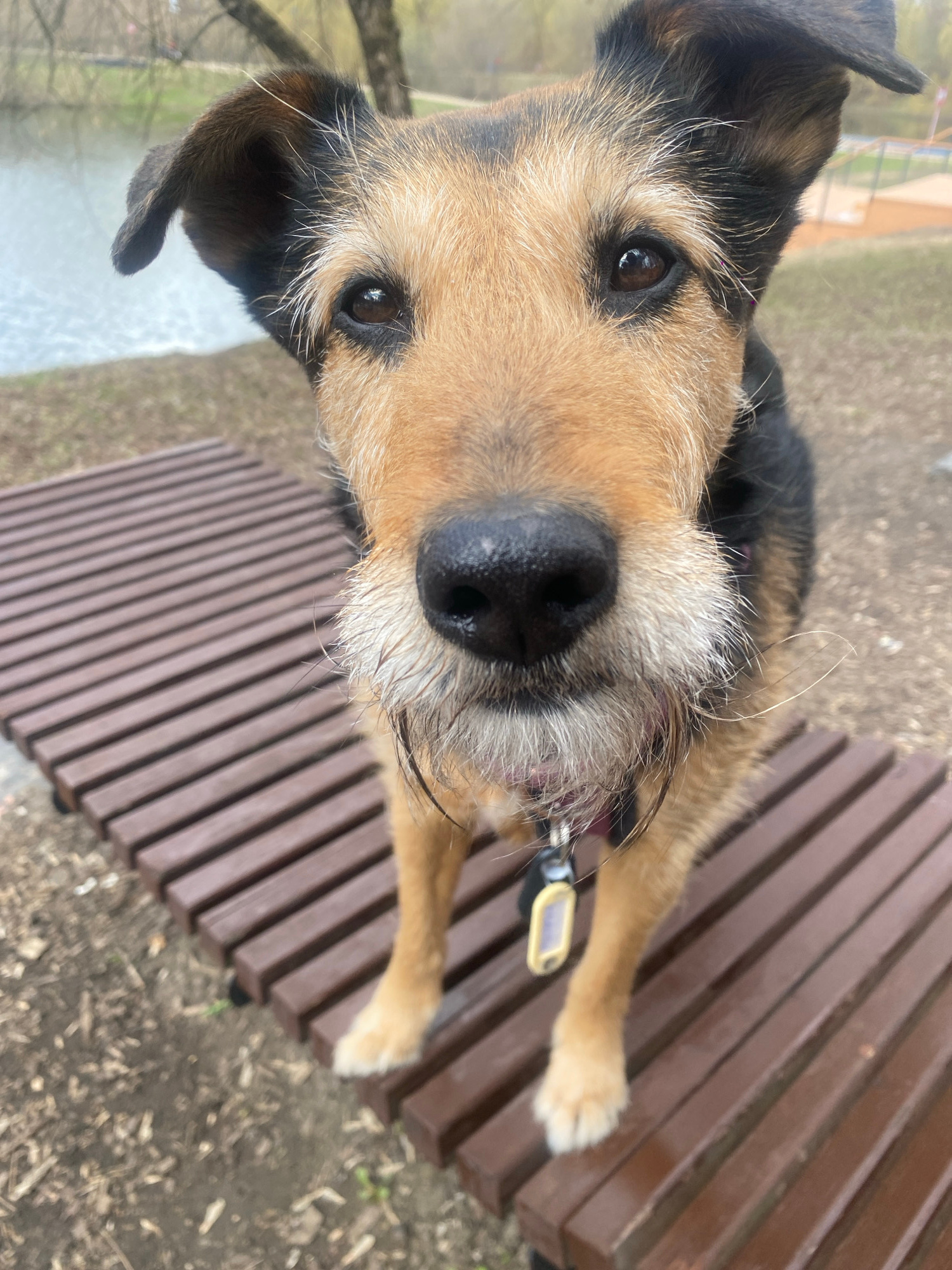 A medium-sized terrier-mix dog sits on a wooden bench. The dog has a black and tan coat with wiry facial hair. The dog wears a collar with an identification tag. The bench consists of multiple evenly…read more