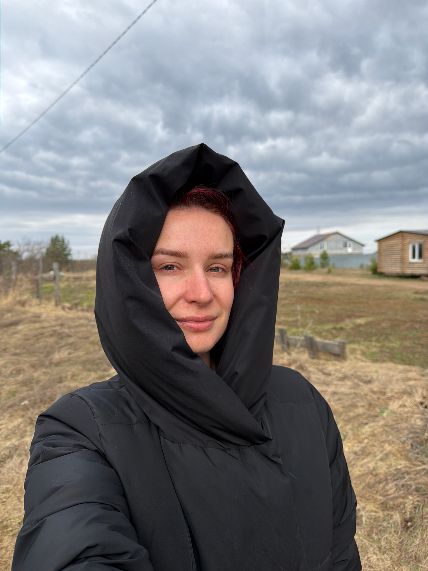 A woman is outdoors, wearing a black hooded puffer jacket with the hood pulled up around her face. She is looking directly at the camera and slightly smiling. The background shows a cloudy sky, a fiel…read more