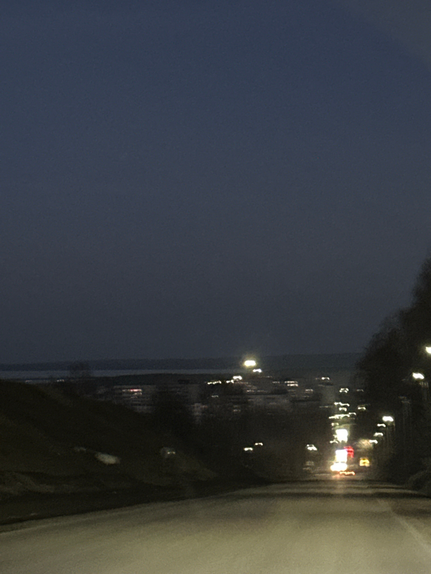 At night, the city of Chaikovsky, Russia, is seen from a high angle, with a body of water to the left. A road runs along the right side, and streetlights illuminate the area. The sky is dark and the c…read more
