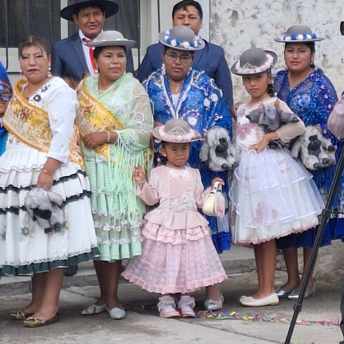 A group of people in traditional clothing stands closely together. The outfits are colorful and tiered with ruffles, embroidery, and lace. Most wear hats with embellishments. A few hold what appear to…read more