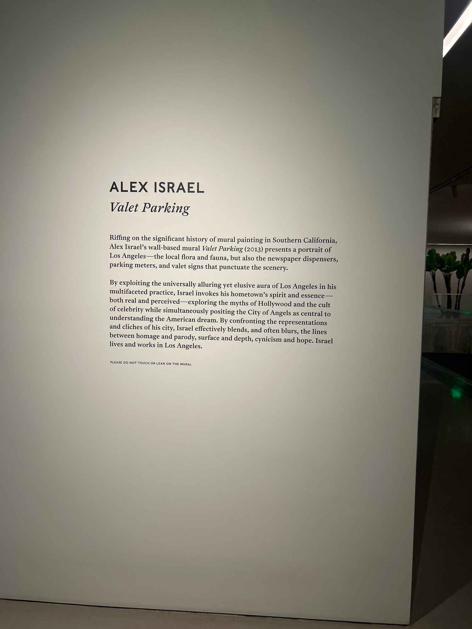 The image shows a sign at an art exhibit for Alex Israel’s “Valet Parking” mural. The text describes the mural as a portrait of Los Angeles. It also mentions the local flora and fauna, newspaper dispe…read more