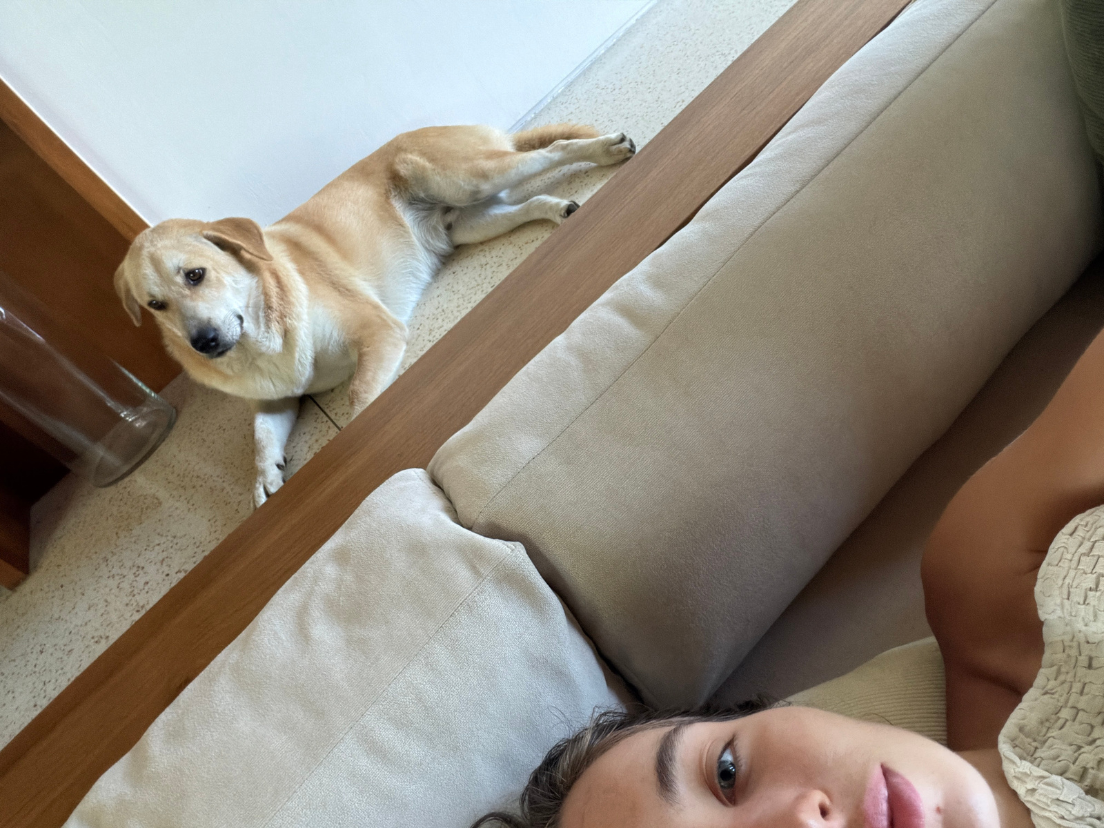 The image shows a woman lying on a light-colored couch, with the camera angled upwards towards her face. The woman has fair skin, dark hair, and is partially visible from the neck up. A light-tan colo…read more