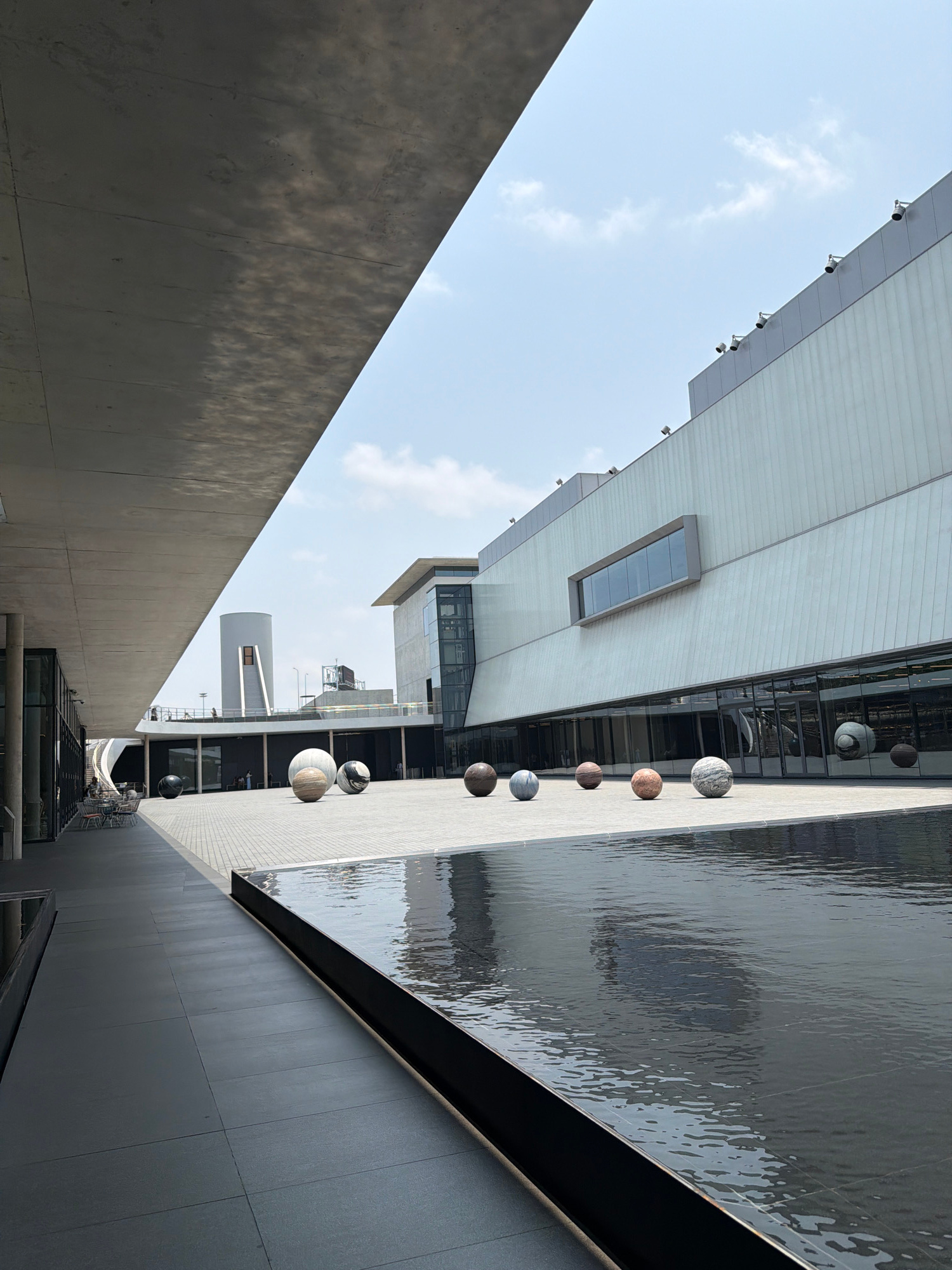 An upward-angle, wide shot depicts a modern architectural scene in Bangkok, Thailand. Dominating the right side of the frame is a water feature, with a dark, reflective surface that distorts the build…read more
