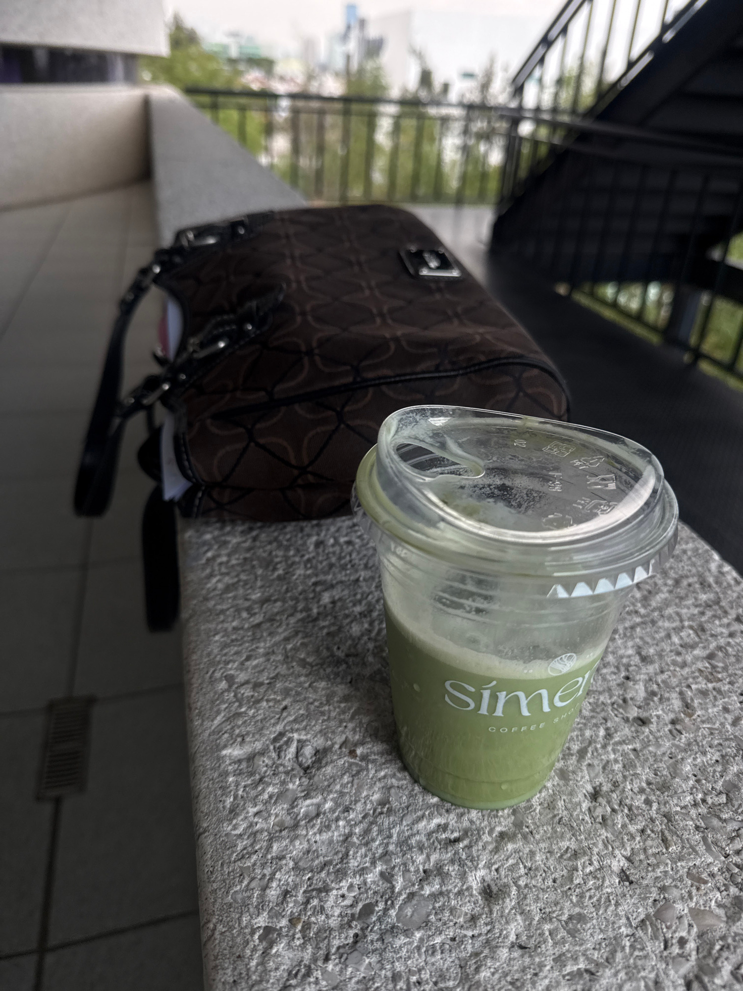 A brown purse with a diamond pattern and black handle is positioned on a concrete ledge. Next to the purse is a clear plastic cup with a green liquid. The cup is labeled "Sime" and "Coffee Shot". The…read more