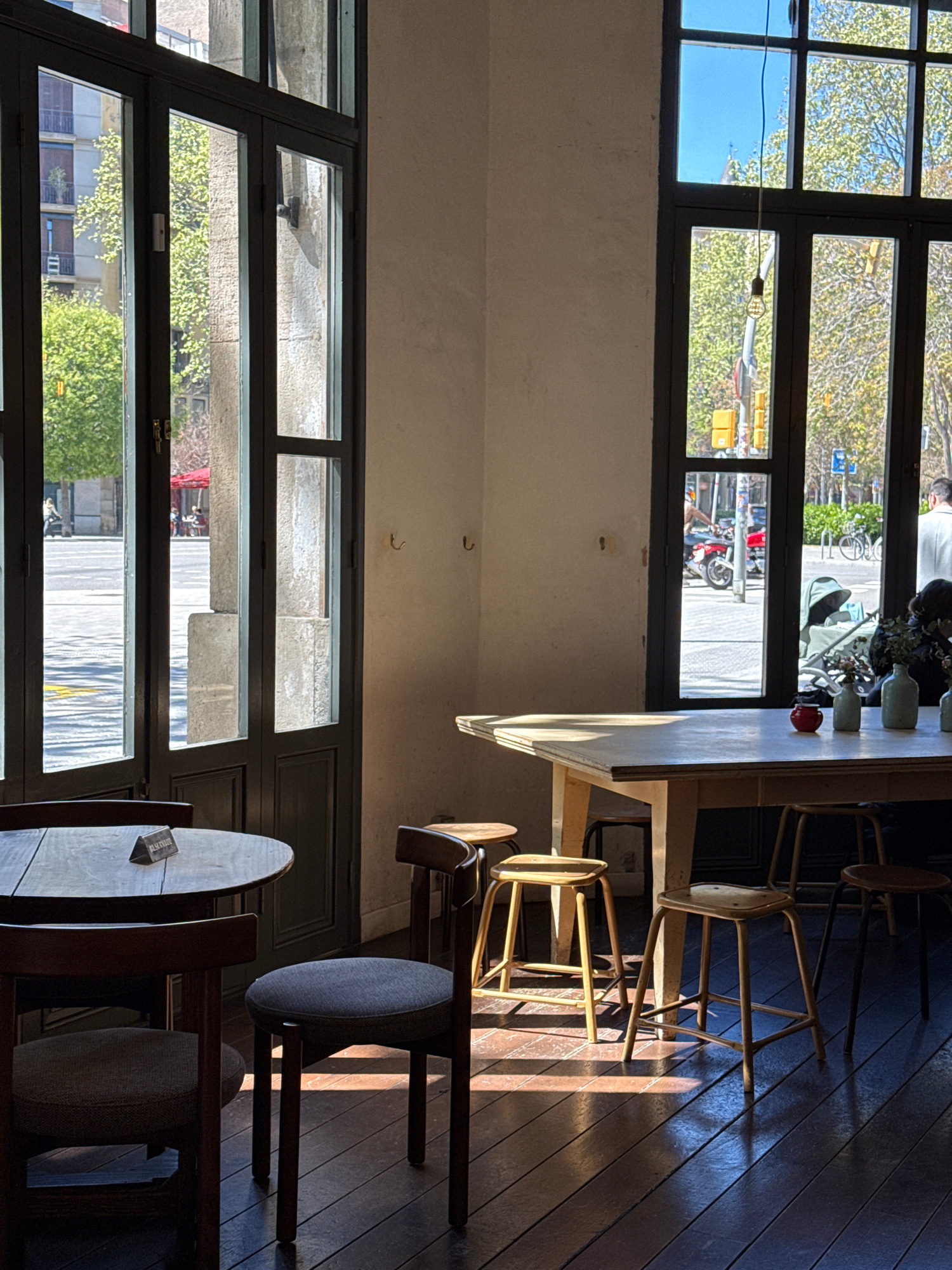 The image shows the interior of a restaurant or café in Barcelona, Spain. A large window with multiple panes provides a view of the street outside, where pedestrians, vehicles, and buildings are visib…read more