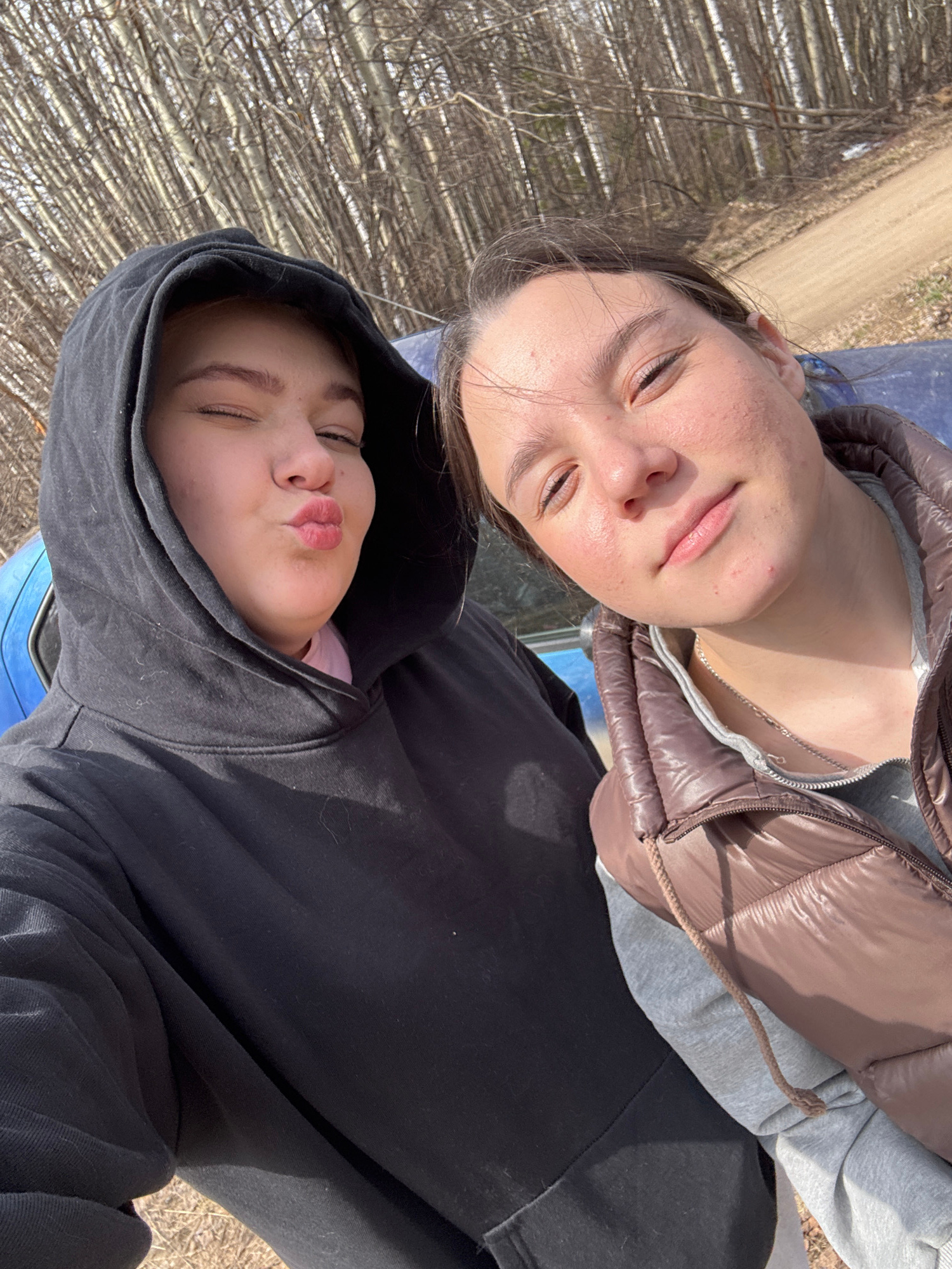 Two young women are in the frame. One is fair-skinned and wears a brown puffer jacket over a gray hoodie. The other has fair skin and wears a black hooded sweatshirt. They are situated next to a blue…read more