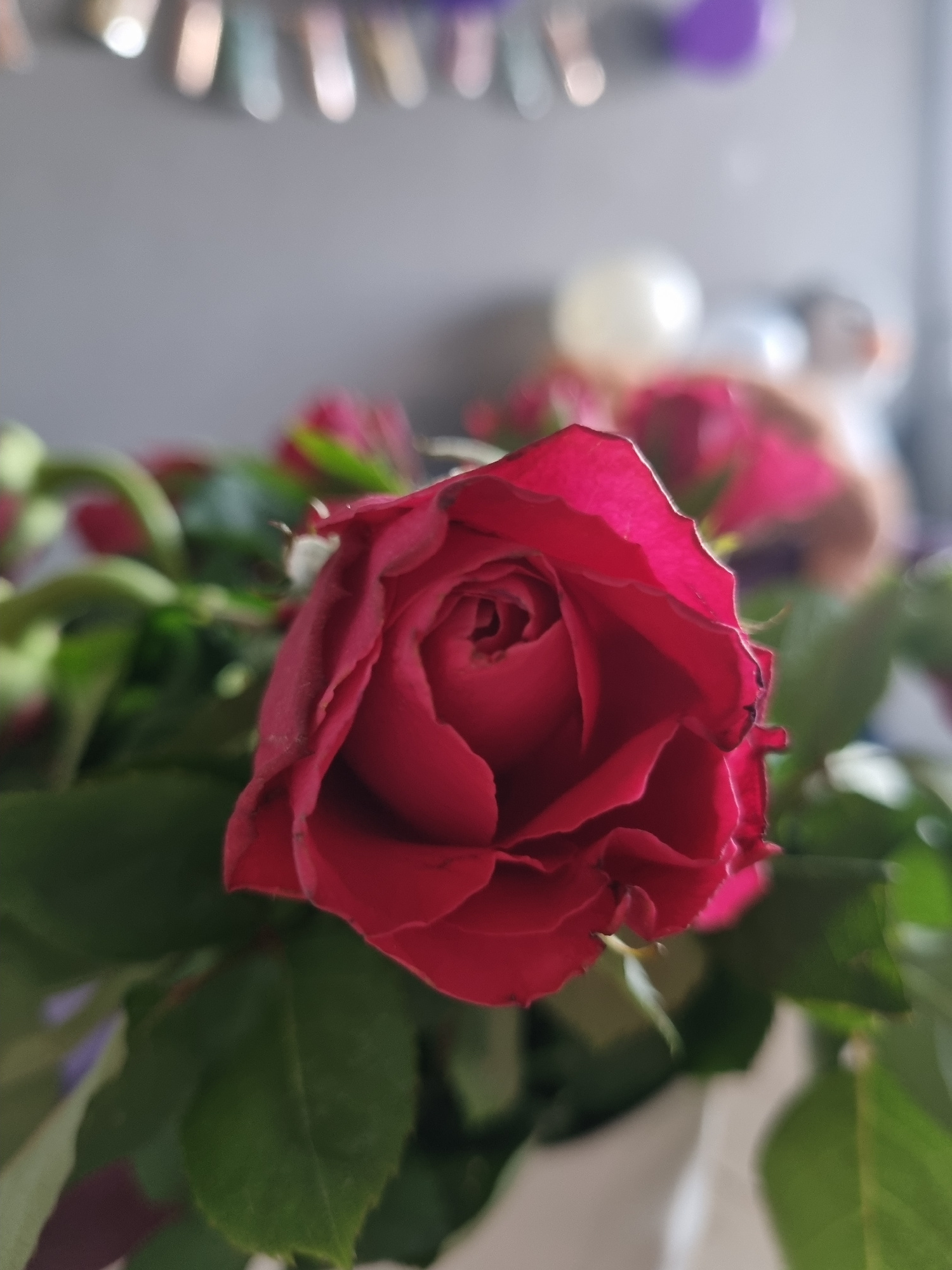 A close-up shot of a red rose, with green leaves visible in the background. Additional roses are blurred in the periphery. In the out-of-focus background on the left are indistinct shapes including wh…read more