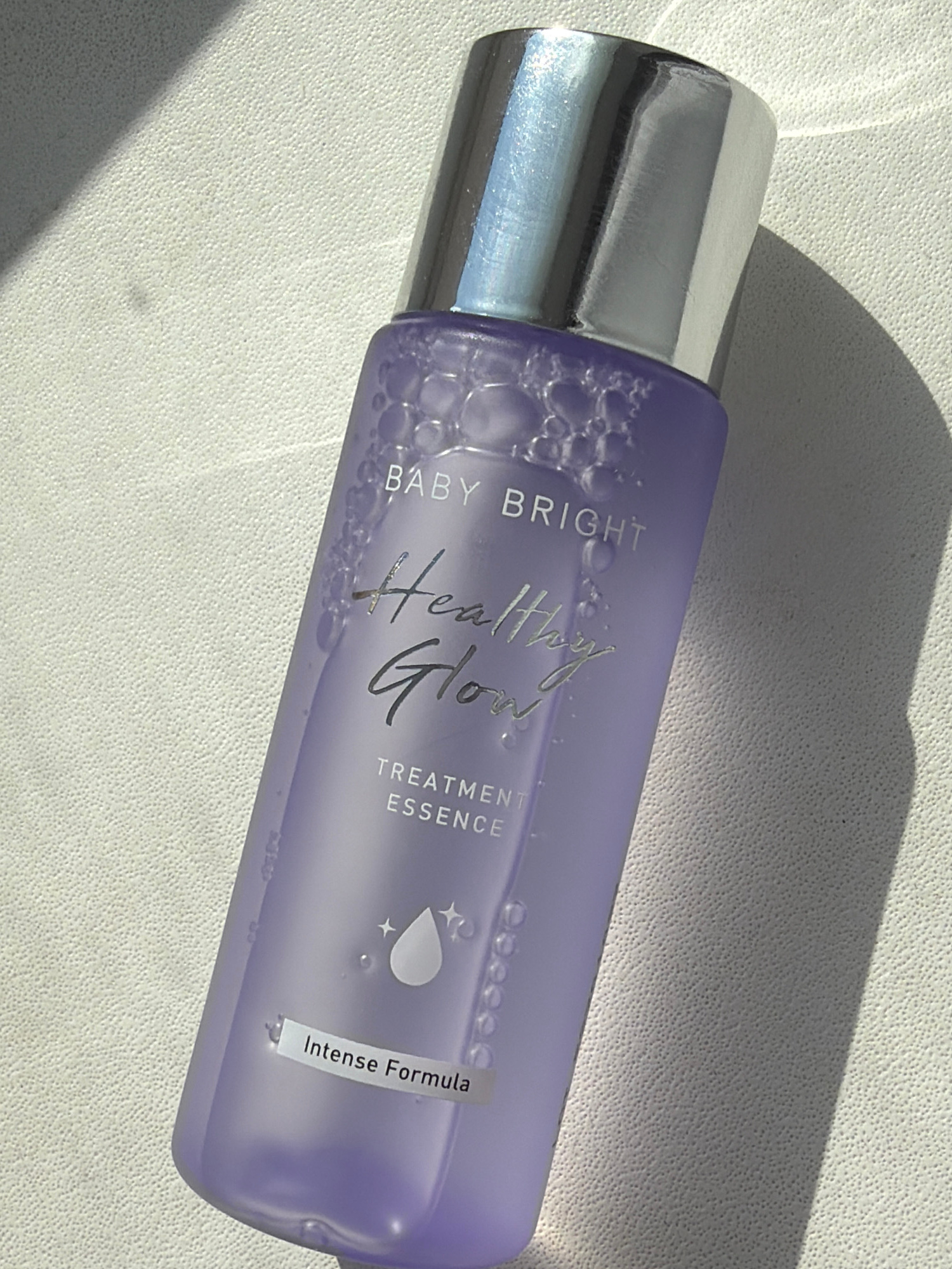 A horizontal eye-level shot depicts a partially filled translucent lavender bottle lying on its side. The bottle has a silver cap and is labeled "BABY BRIGHT Healthy Glow TREATMENT ESSENCE Intense Forβ¦read more