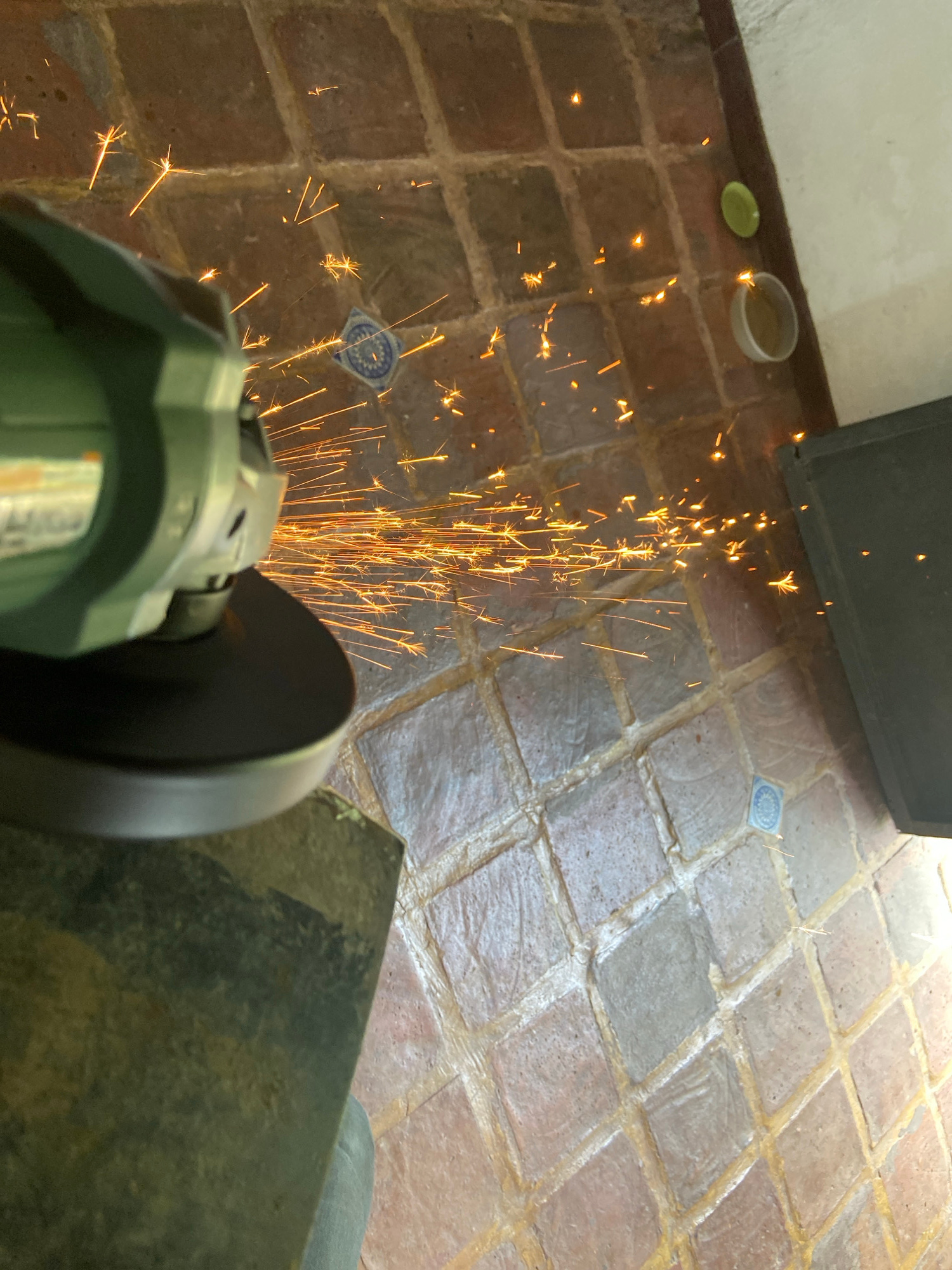 A close-up image shows a power tool, likely an angle grinder, creating sparks on a tiled floor. Two small containers, one green and one clear, sit on the floor to the left. A dark object, possibly a p…read more