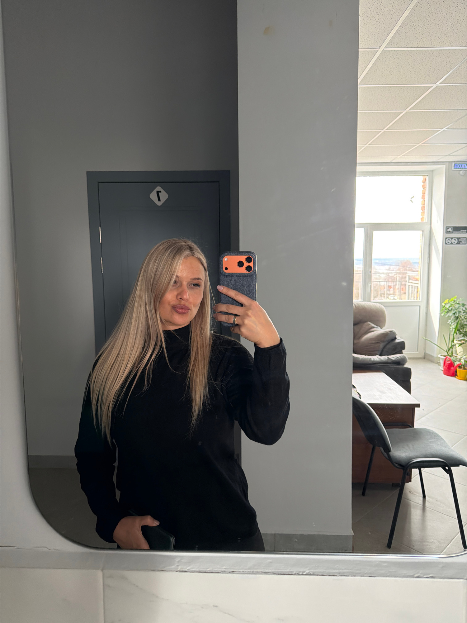 A woman is taking a selfie in a mirror. She is wearing a black turtleneck sweater and has long, blonde hair. She is holding a phone in her right hand. The mirror reflects a hallway with a door and a w…read more