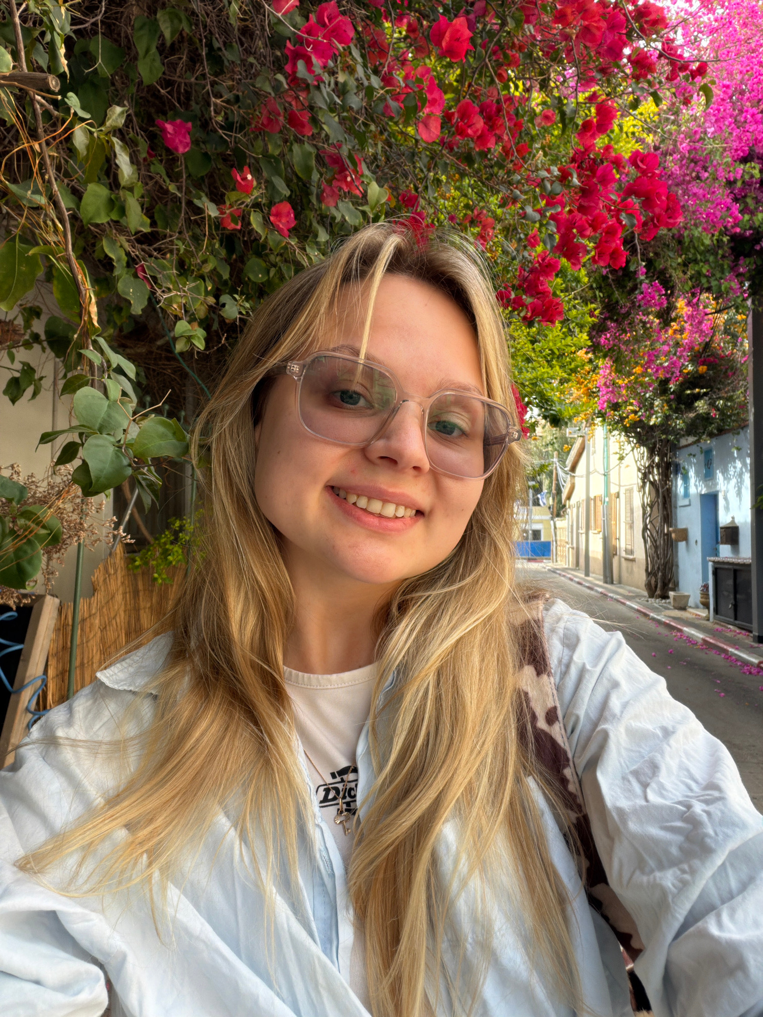 The image depicts a young woman in Tel Aviv, Israel, likely taking a selfie. She is fair-skinned with blonde hair and is wearing clear-framed glasses. She is smiling and appears to be outdoors, with a…read more