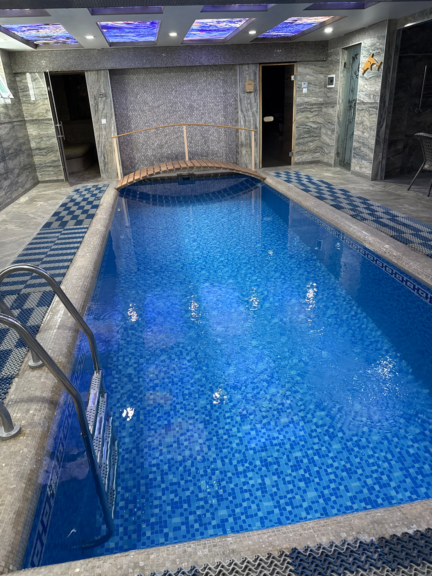 The image shows an indoor swimming pool in what appears to be a private residence or a small hotel. The pool is filled with clear blue water and lined with blue mosaic tiles. A metal ladder provides a…read more