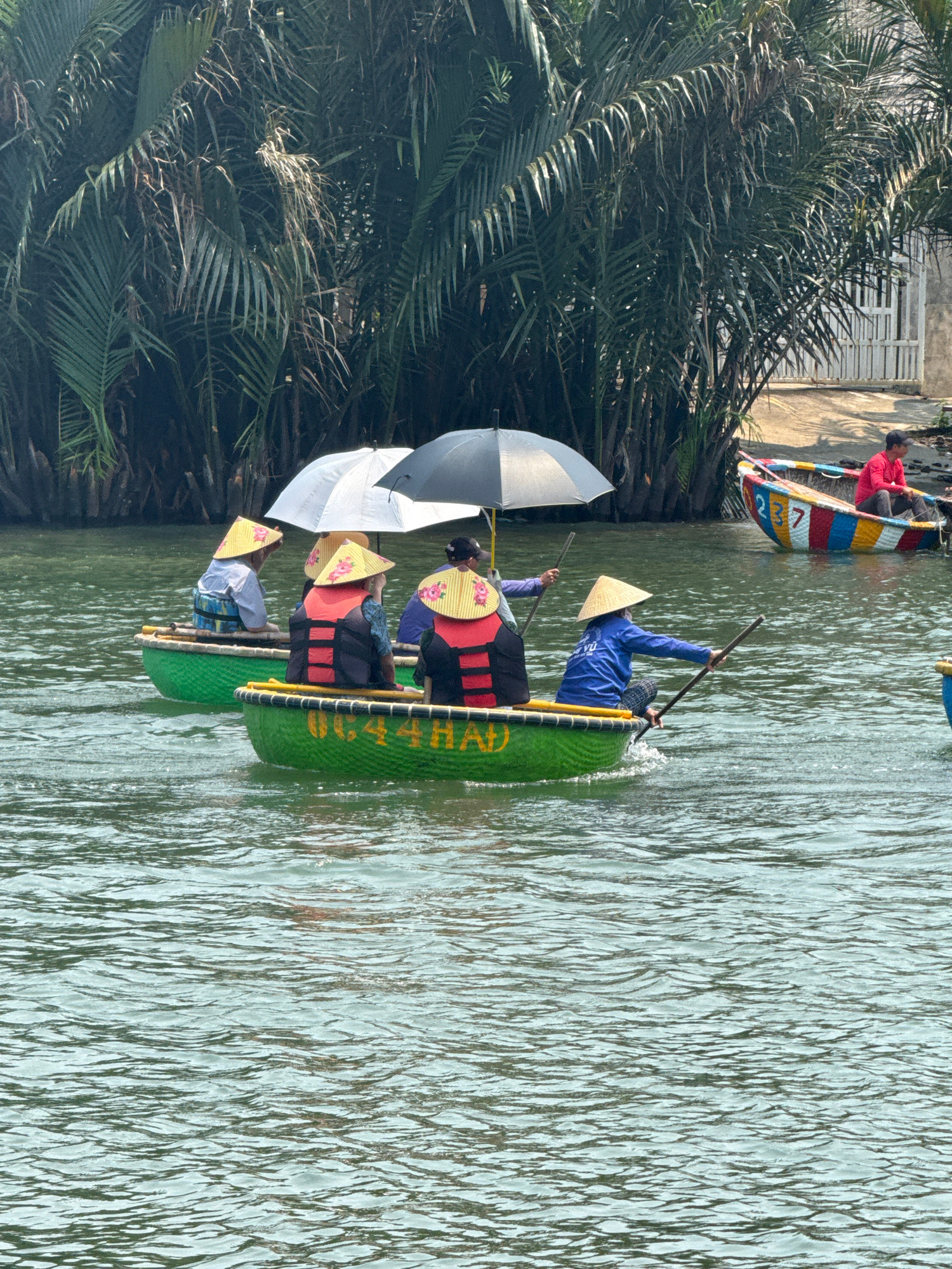 This vibrant daytime photograph depicts a group of people enjoying a boat ride on a calm river, framed by lush tropical vegetation. The primary focus is a long, green boat, likely a traditional Vietn…read more