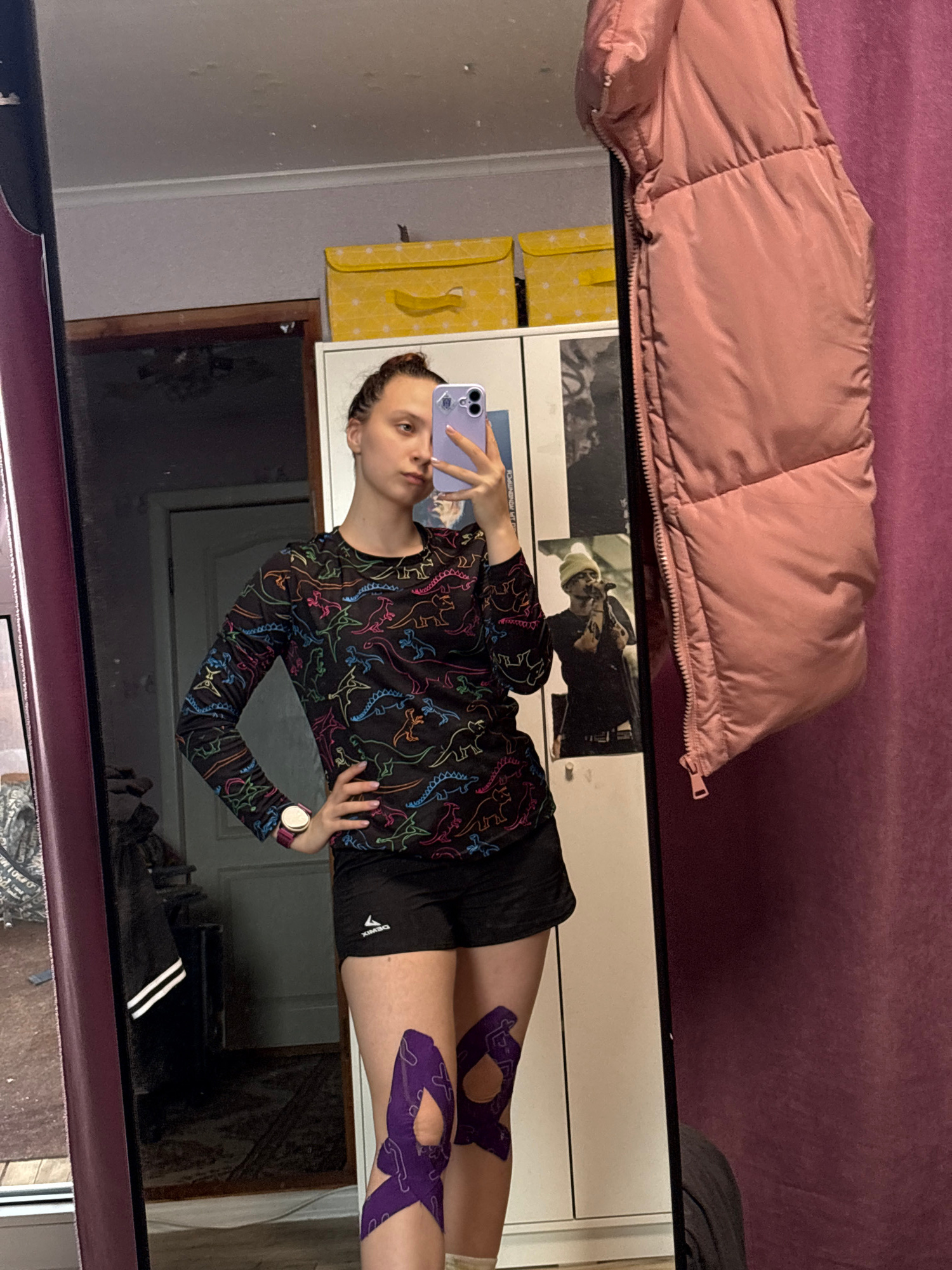 A young woman stands facing a mirror, holding a light purple smartphone to capture a selfie of her reflection. She has light brown hair pulled back and a neutral expression as she looks at the phone.…read more